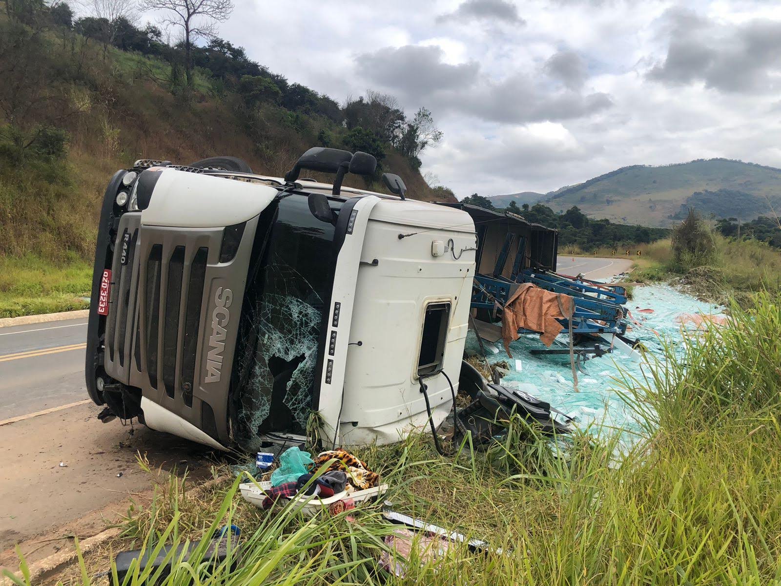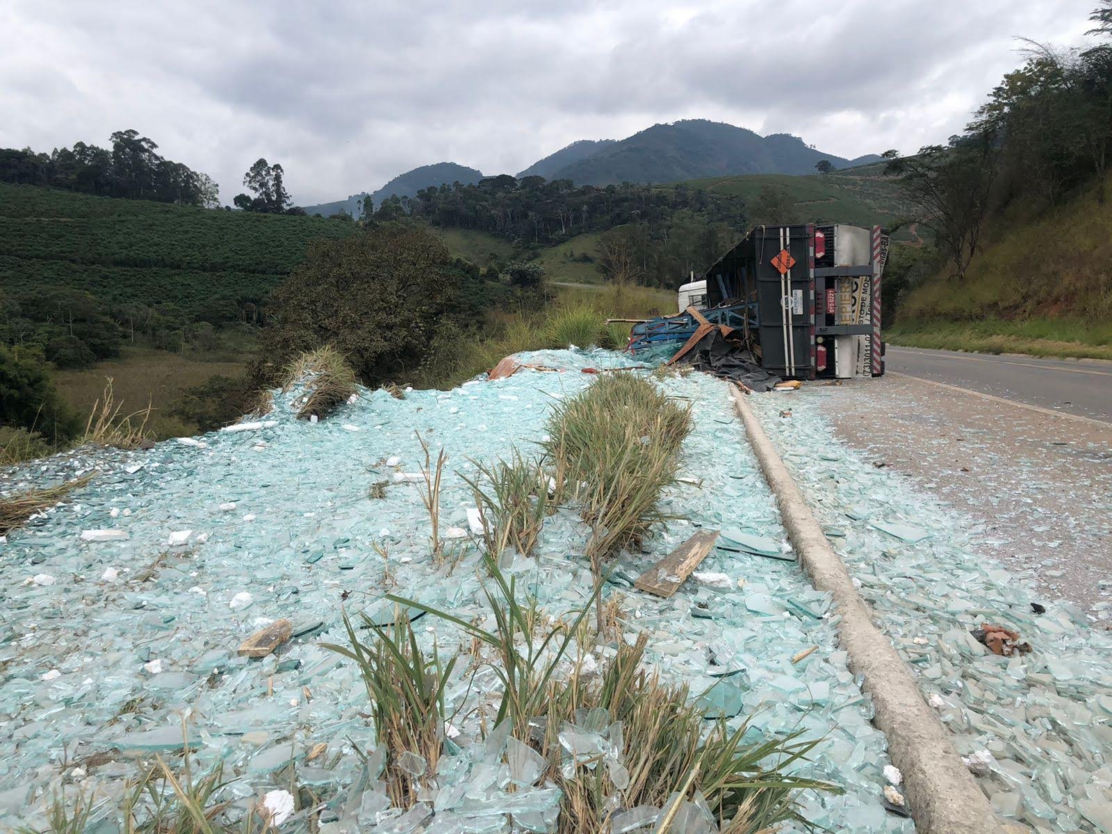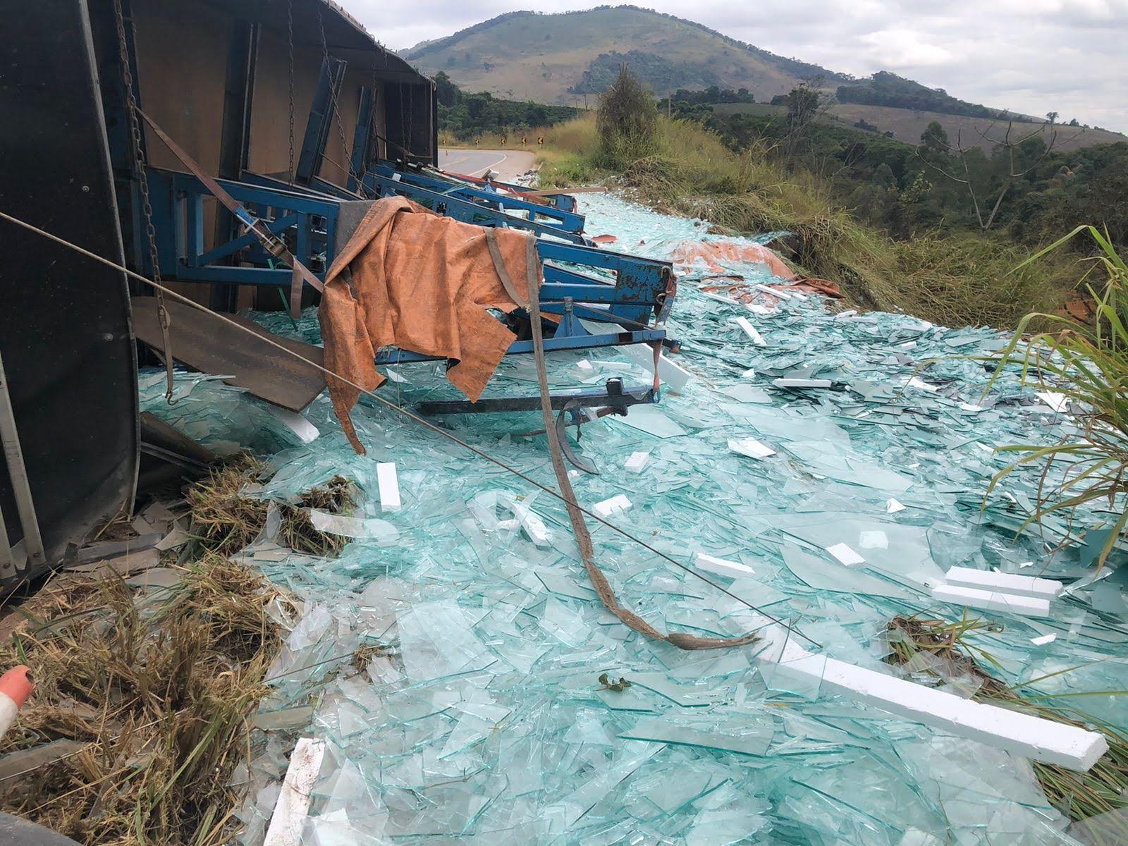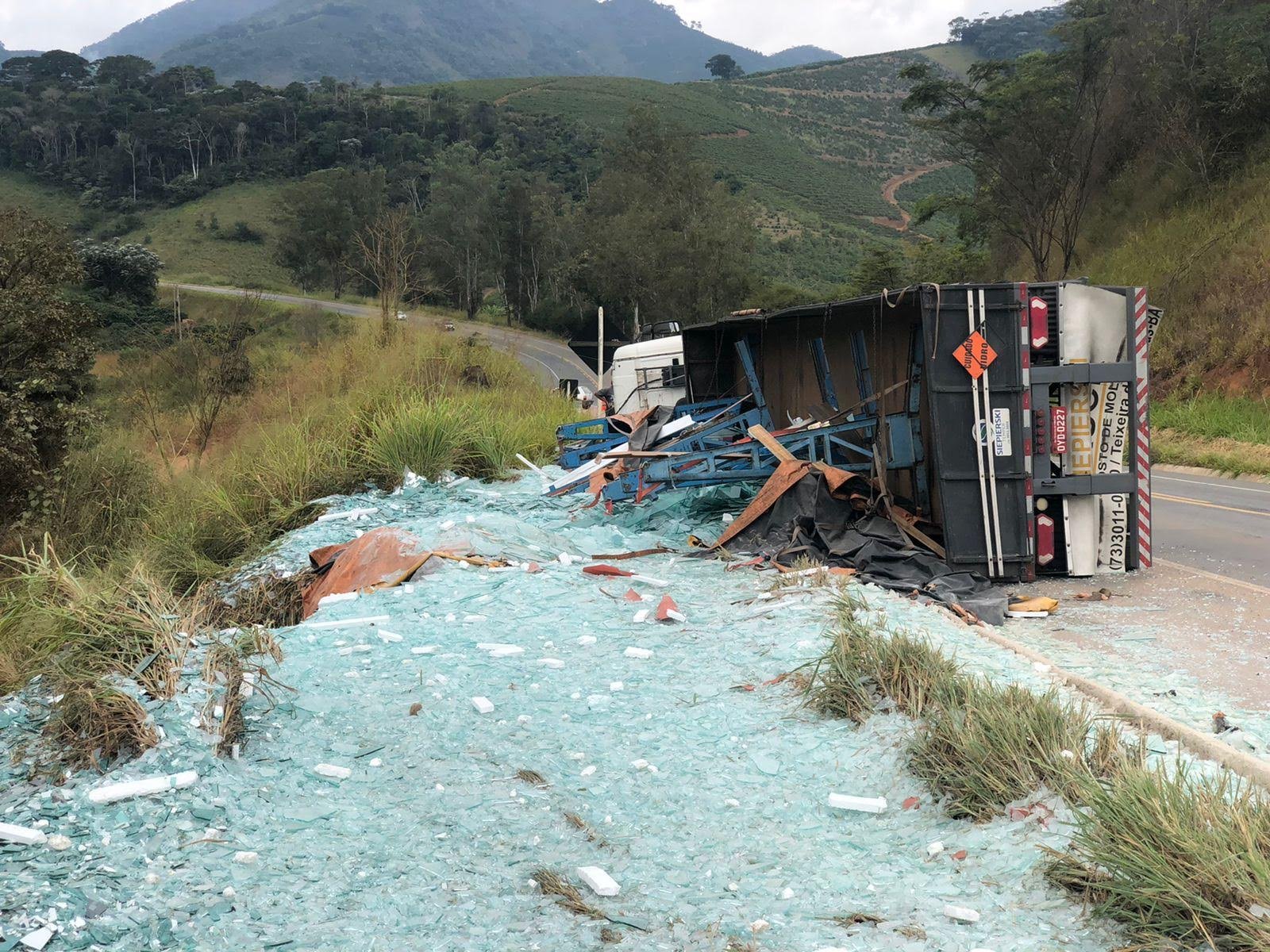 MANHUAÇU (MG) - Uma carreta Scania, com placa de Teixeira de Freitas - BA, tombou na BR-116 no início da tarde deste sábado (28), em Vila de Fátima, próximo a São Pedro do Avaí, distrito de Manhuaçu. O veículo transportava vidros temperado e a carga ficou totalmente quebrada e espalhada em uma área de vegetação na margem da rodovia.
