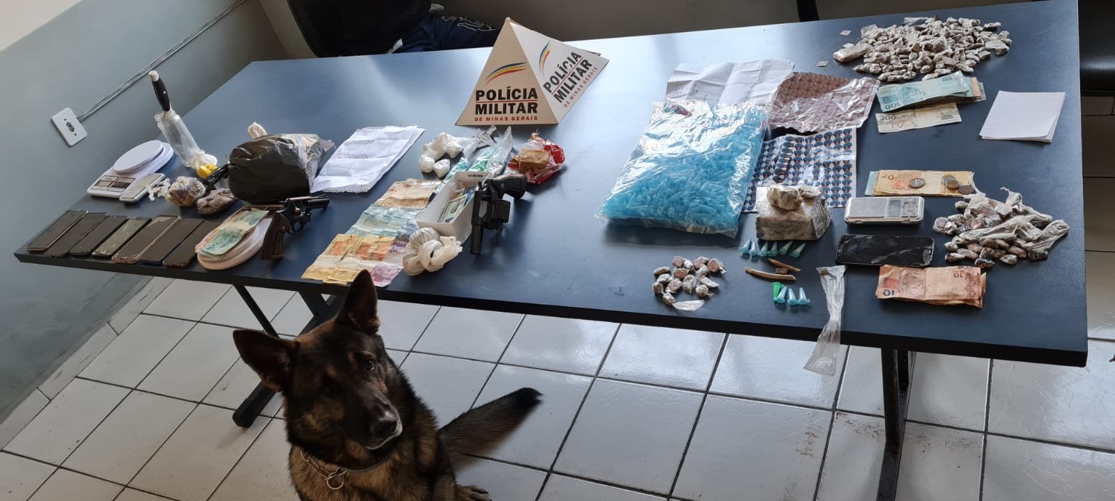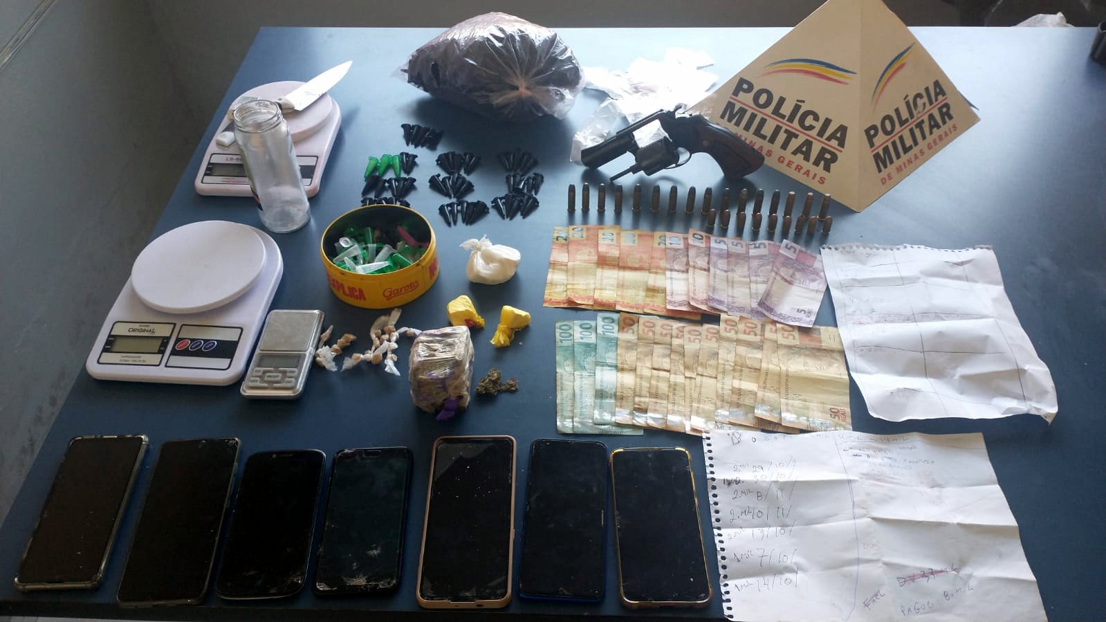 Foram presos seis autores de tráfico de drogas entre 18 e 34 anos, e apreendidos dois revólveres calibre 38, 38 munições de calibres .38 e .380, R$2.980,50 em dinheiro, uma nota falsa de R$200,00, 83 pinos, três pedaços e quatro papelotes médios de cocaína, uma pedra média e 29 pedras comerciais de crack, uma barra de aproximadamente meio quilo de maconha prensada, um pedaço médio, dois tabletes e 139 buchas de maconha e outros materiais comumente utilizados para a traficância.