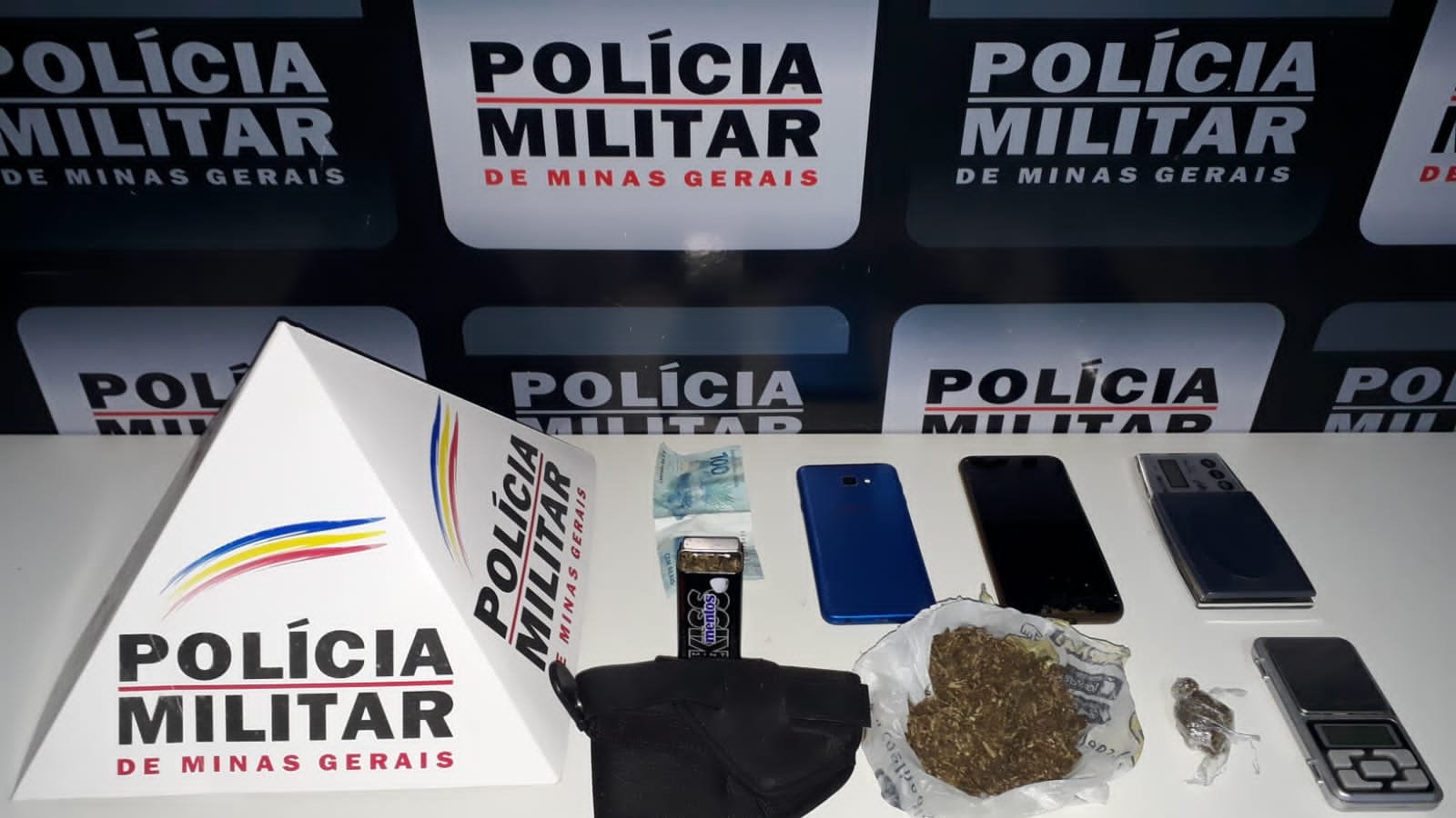 Em continuidade às diligências, foi realizada busca na residência do autor, sendo localizadas 02 buchas de maconha, 02 balanças de precisão, 01 coldre e 02 celulares, sendo um com queixa furto.