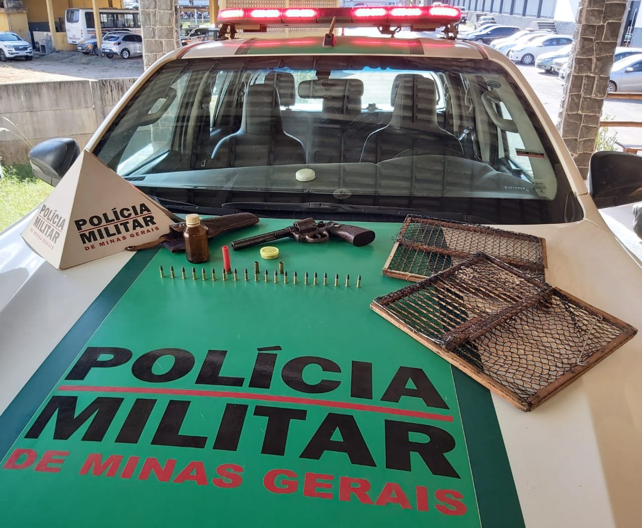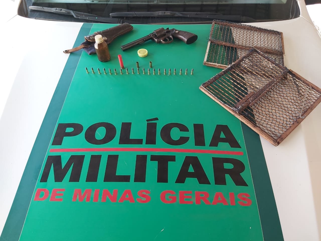 Durante a diligência, foi realizada busca no domicílio e encontrado dentro de um guarda-roupas um revólver calibre 22 municiado e um total de 20 munições para a citada arma. Além da arma que não possuía registro, foi também apreendido 02 armadilhas para captura de aves silvestre na natureza.