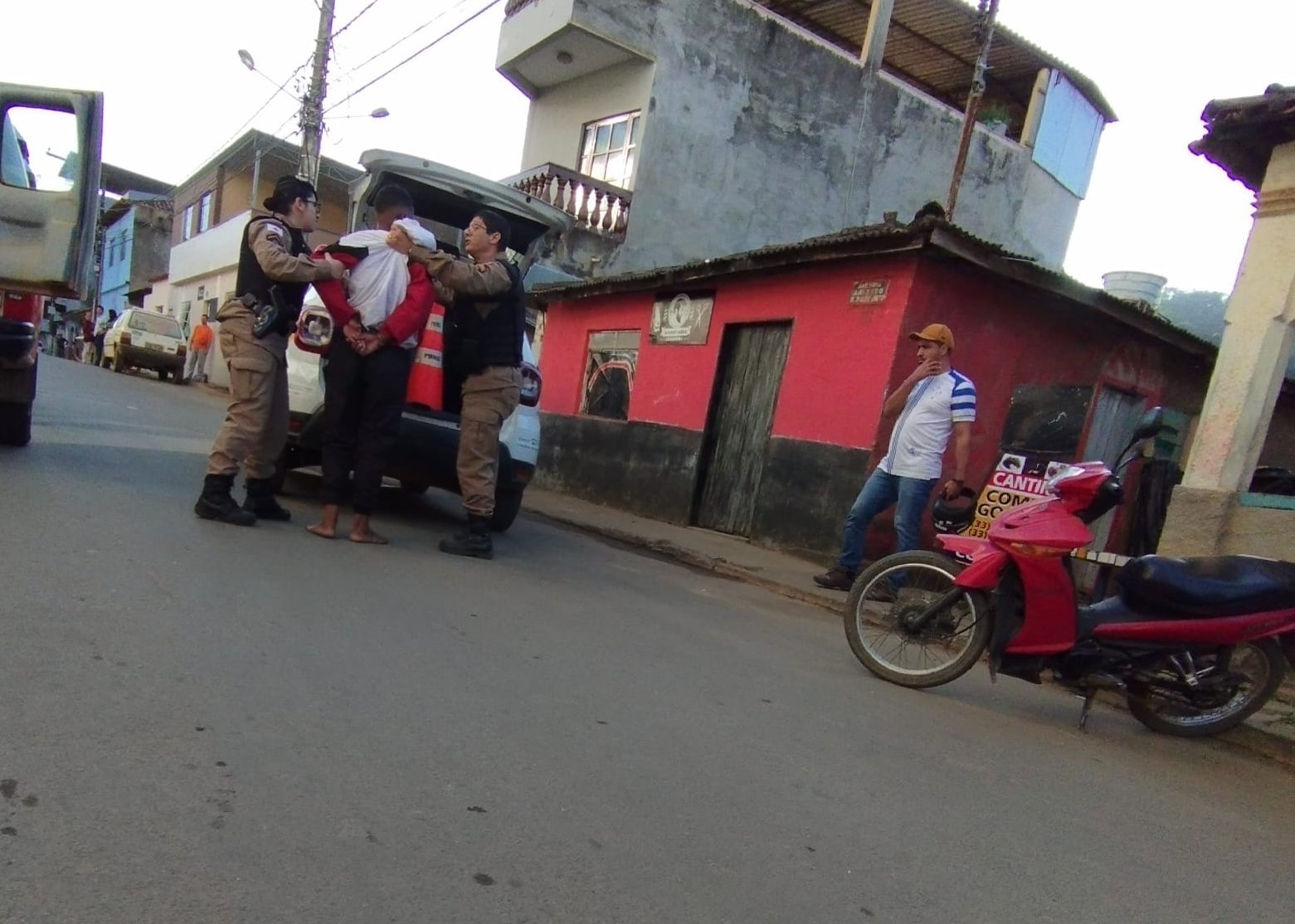 A imagem foi registrada por um internauta. Na via pública, a vítima segura o homem que lhe assaltou momentos antes em seu estabelecimento comercial em Simonésia. A Polícia Militar chega na sequência