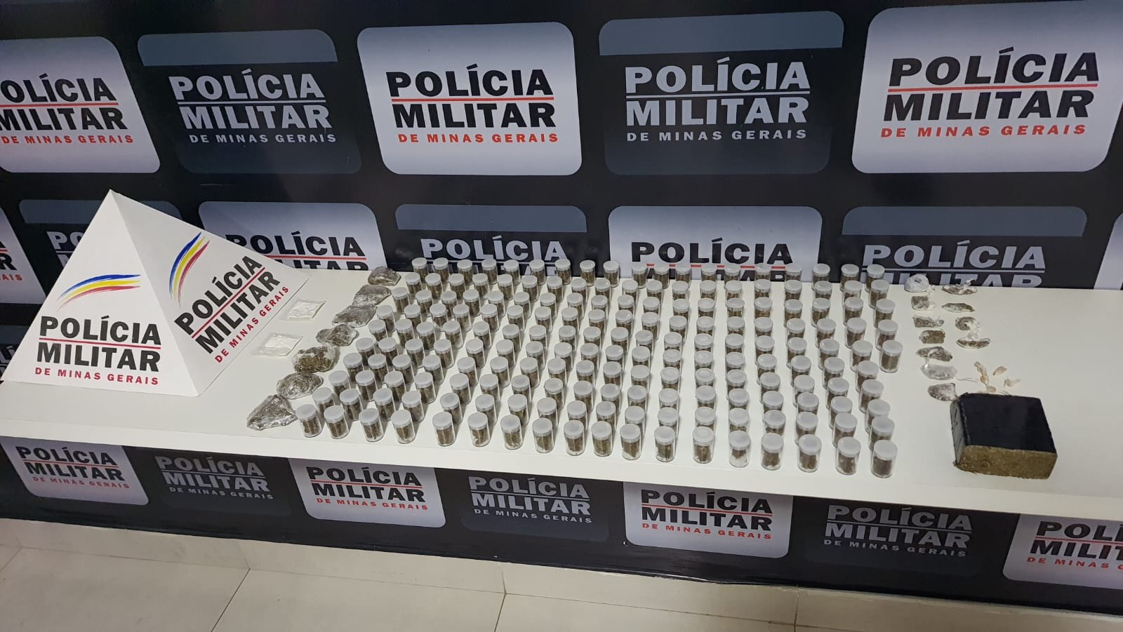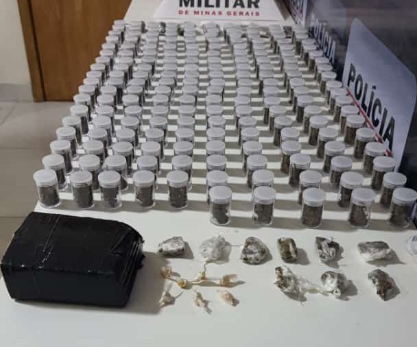 Na residência do menor, a equipe da PM realizou mais diligências, e novamente com a aplicação do cão de faro Aquiles e buscas dos militares do Tático Móvel, foram localizadas numa parede falsa mais 185 frascos contendo maconha, além de 07 tabletes médios e meia barra de maconha.