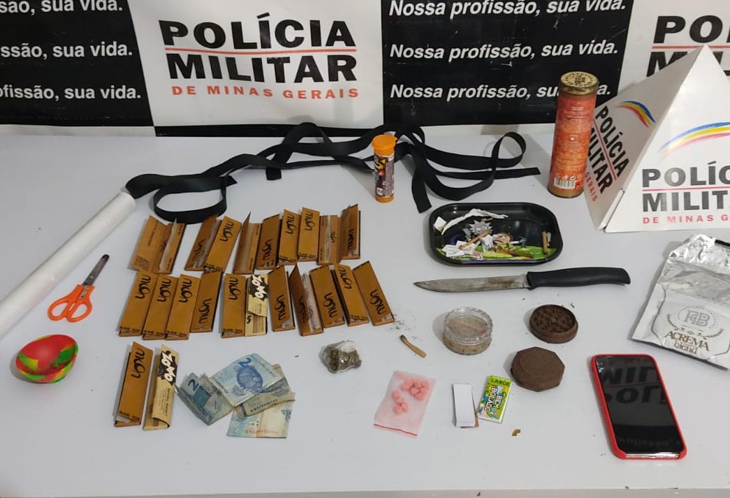 Após buscas na referida residência foram localizados pelos policiais, 12 comprimidos de ecstasy, 01 tablete de maconha, 01 aparelho celular e diversos materiais utilizados para o preparo e fracionamento das drogas.