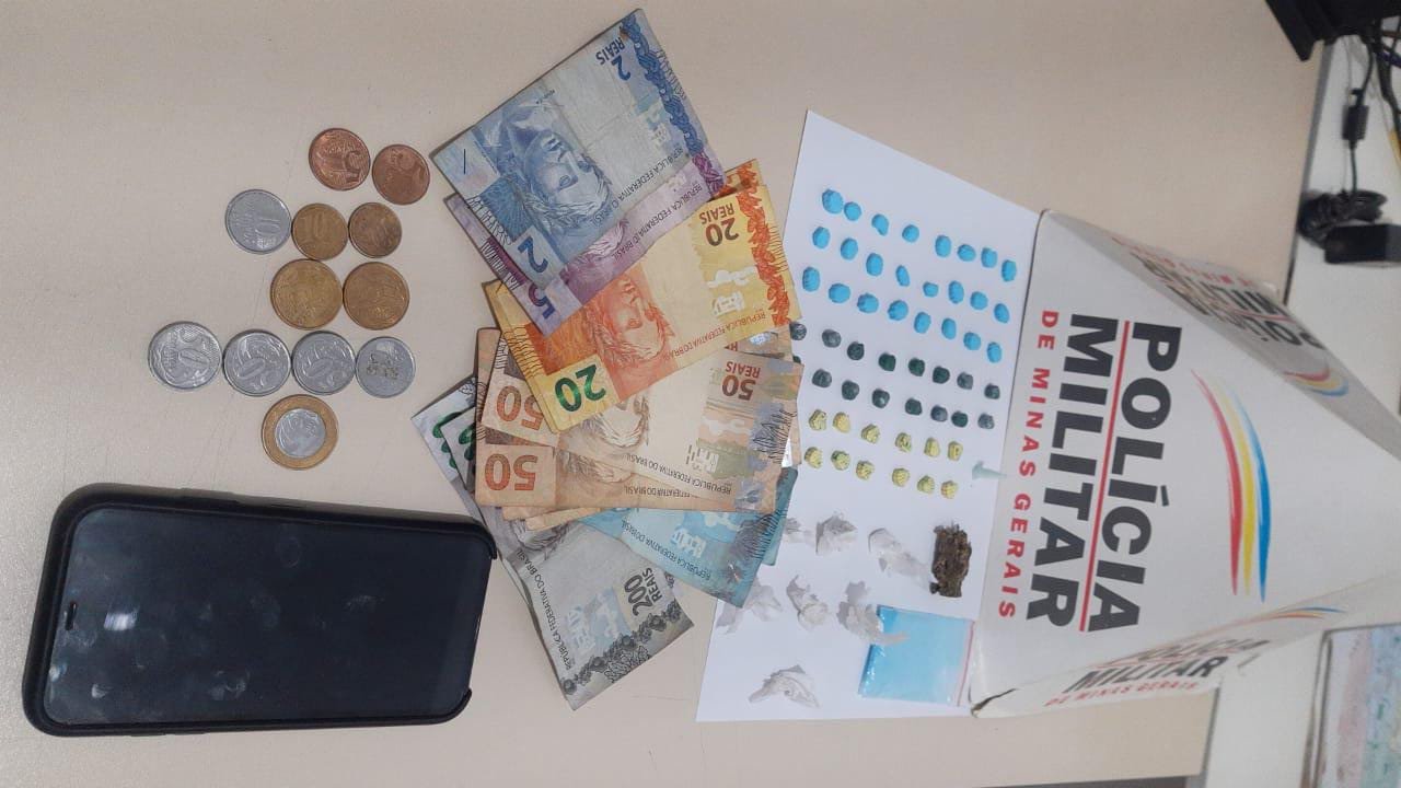 Durante as buscas no veículo, foram localizados 46 comprimidos de ecstasy, 07 papelotes e 01 pino de cocaína e R$ 1.392,00 em espécie.