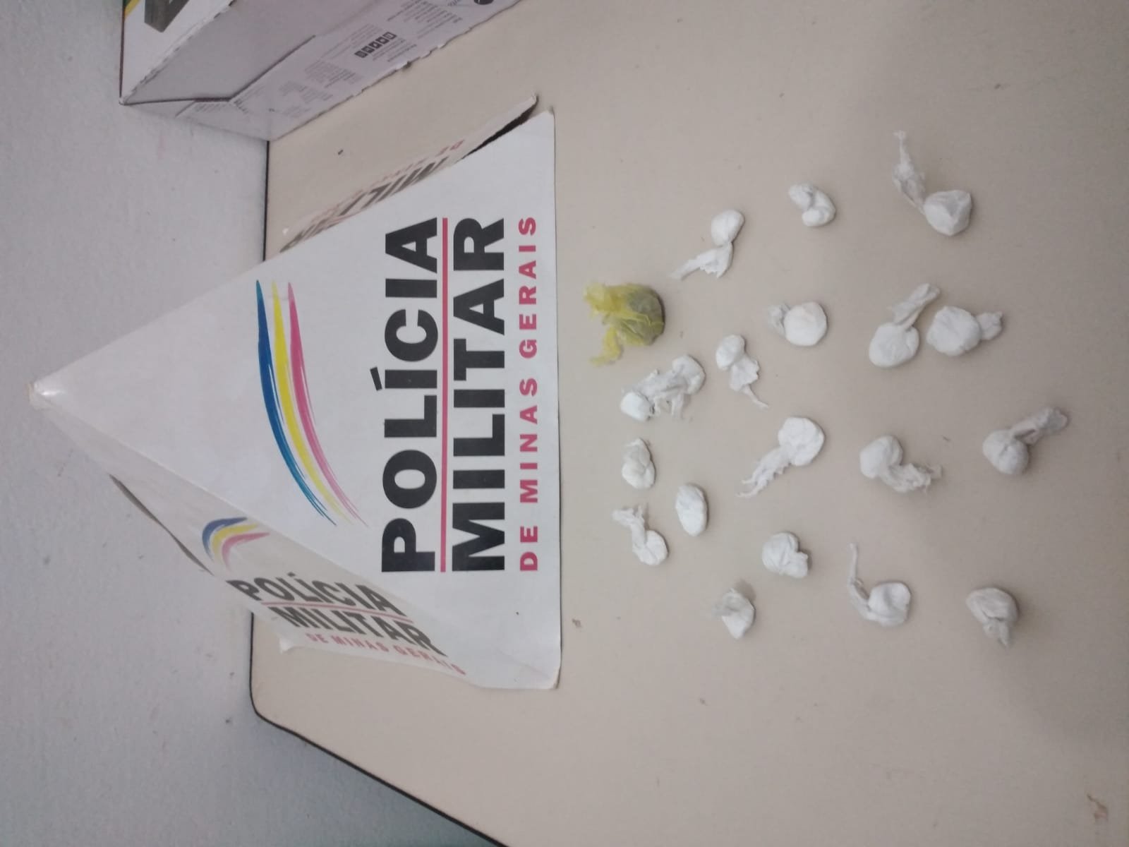 Foi localizado em poder do rapaz, dentro de um maço de cigarro, uma bucha de maconha, logo após ele foi encaminhado à equipe da Polícia Militar, e após passar por revista minuciosa, onde seu tênis foi retirado, foram localizadas, dentro da meia do autor, 19 papelotes de cocaína.