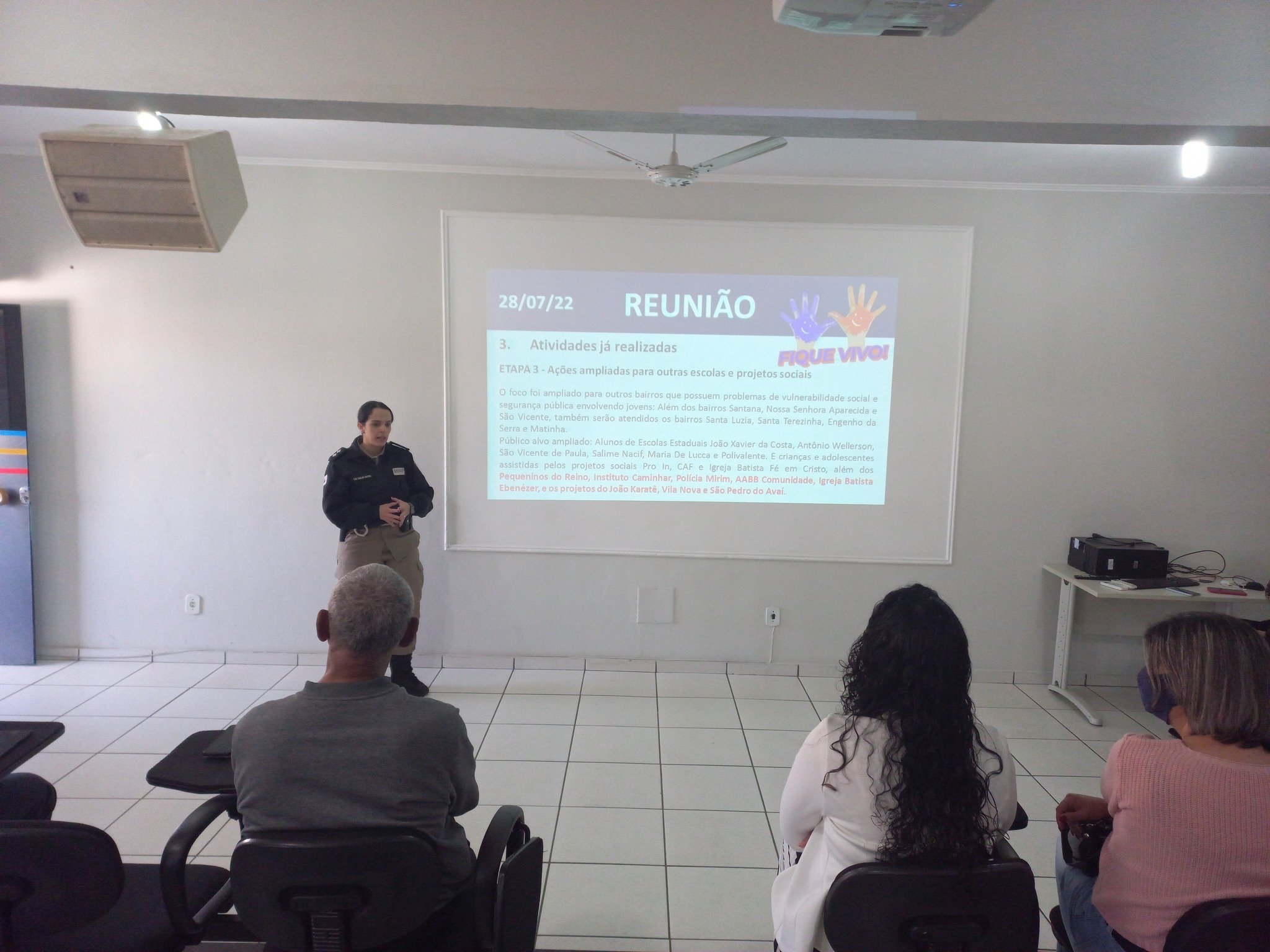 O conteúdo e o objetivo do projeto foram repassados aos presentes pela Tenente Suelen, representante da Polícia Militar no Fique Vivo. Logo após foi levantado os dias disponíveis para atuação do Fique Vivo dentro dos projetos.