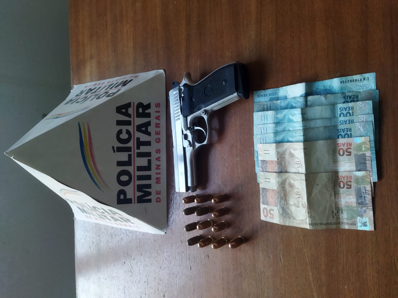 Durante verificação do veículo, foi encontrada uma Pistola 45, 13 cartuchos e R$ 600,00.