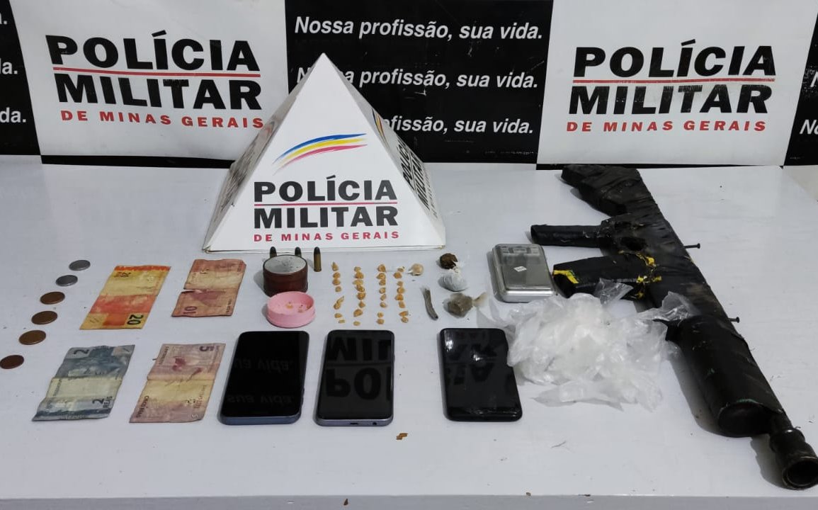 Durante a abordagem foi encontrada uma réplica de uma submetralhadora, 32 pedras de crack já fracionadas para venda, uma porção de crack, três buchas de maconha, três celulares, um cigarro de maconha, uma balança de precisão, dinheiro, três munições calibre 32 intactas, um dichavador, diversos sacos plásticos, um recipiente contendo resquícios de crack.