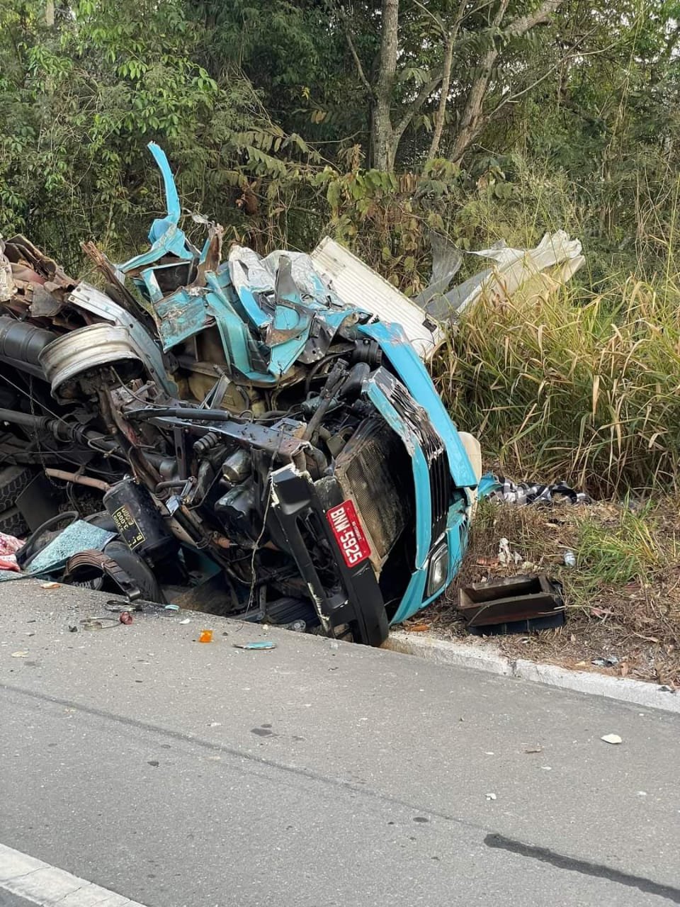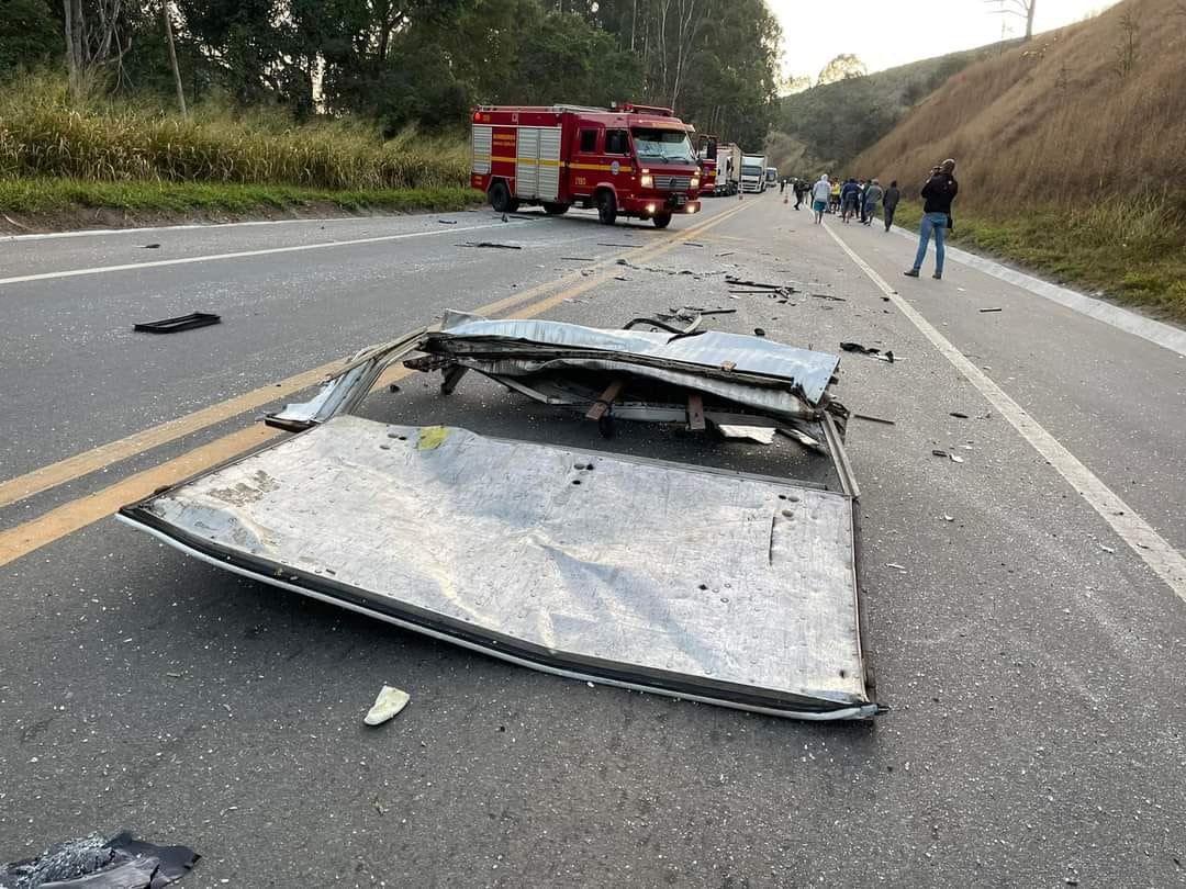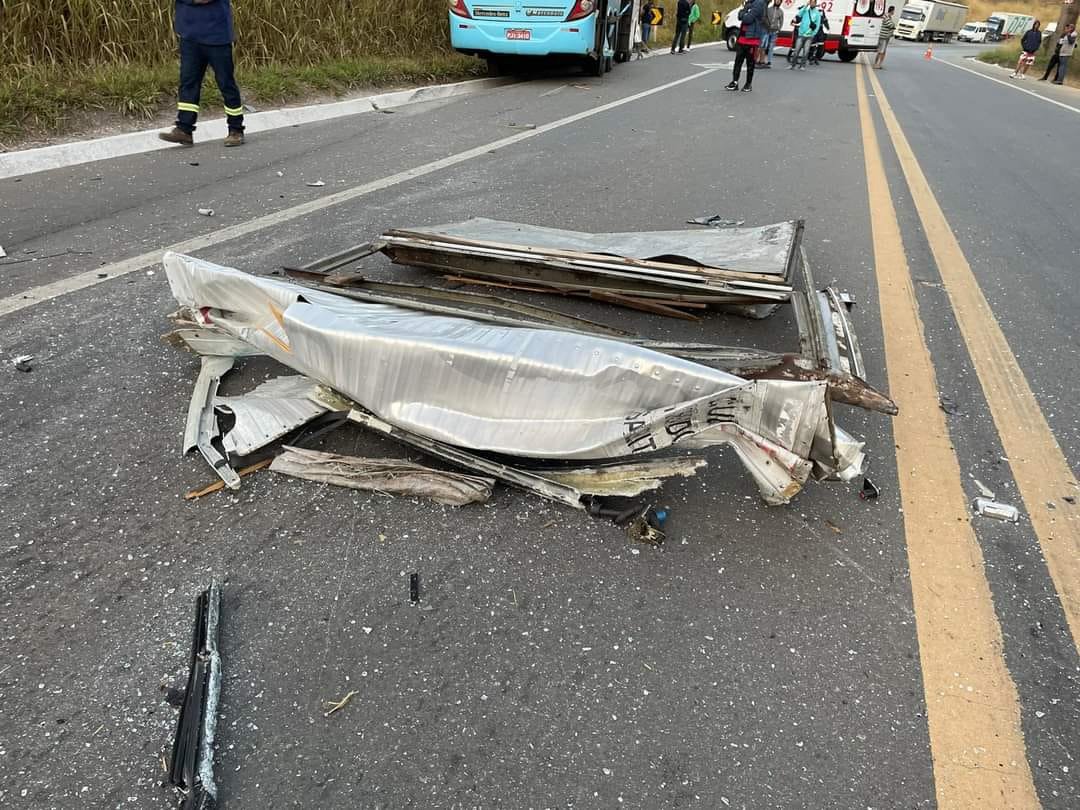 SANTA BÁRBARA DO LESTE (MG) - Diversas peças dos veículos ficaram espalhadas pela pista e o modelo do caminhão ficou praticamente irreconhecível, demonstrando a gravidade da colisão. O acidente envolvendo um ônibus da Viação Emtram e um caminhão baú aconteceu por volta de 05h da manhã deste sábado, 06/08, na BR-116, trecho conhecido como “Serra do Peão”, na cidade de Santa Bárbara do Leste.