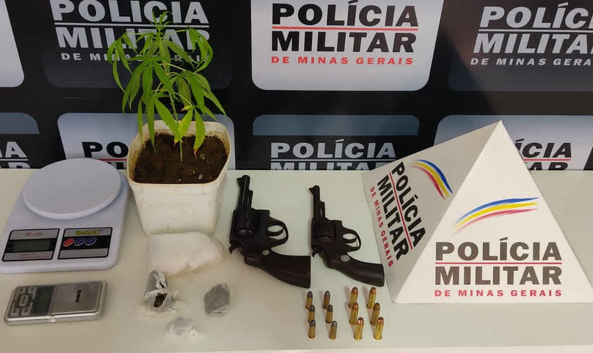 Durante as buscas foram localizados 01 revólver calibre .32 e 06 munições do mesmo calibre, 01 revólver calibre.38 e 08 munições do mesmo calibre, 04 porções de maconha, 02 balanças de precisão, 01 pé de maconha e materiais para embalar drogas.