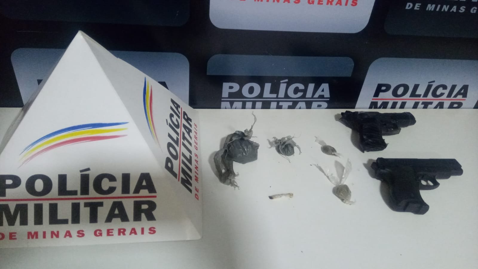 Durante buscas, foram encontradas duas réplicas de arma de fogo, além de 03 porções e 01 cigarro de maconha.