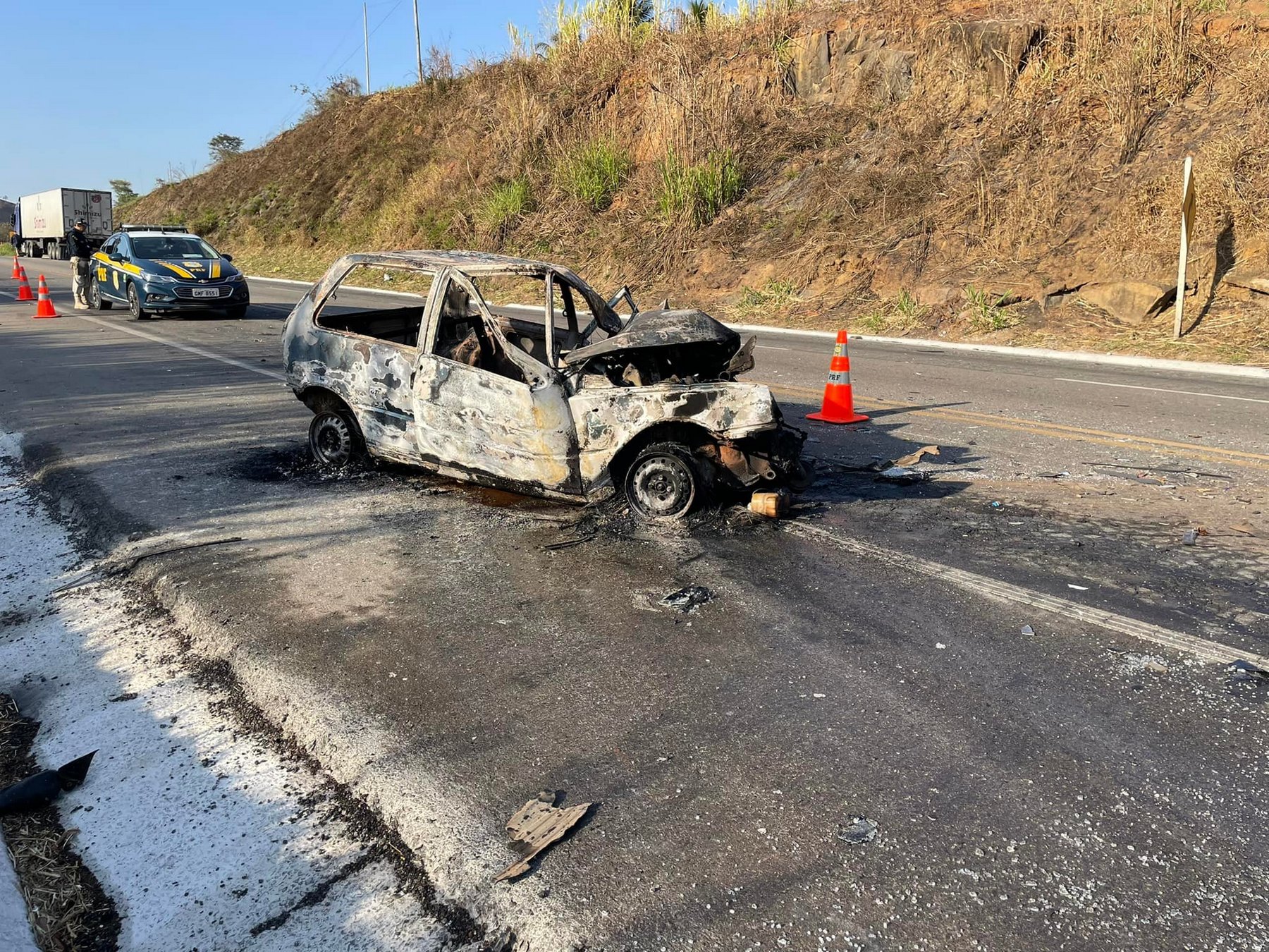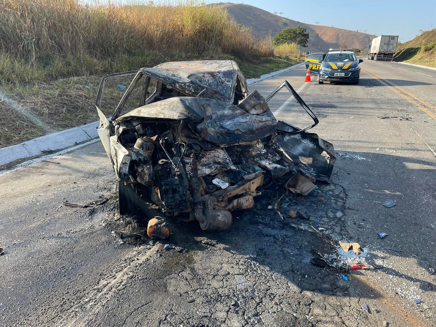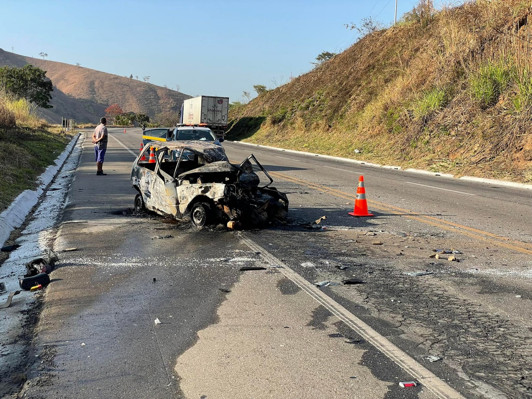 INHAPIM (MG) - Este é o cenário de mais uma fatalidade na BR-116, em Inhapim. O Fiat Uno, com placas de Manhuaçu, foi completamente destruído pelas chamas após colidir de frente com uma carreta na altura do KM 497. O condutor do carro morreu carbonizado.