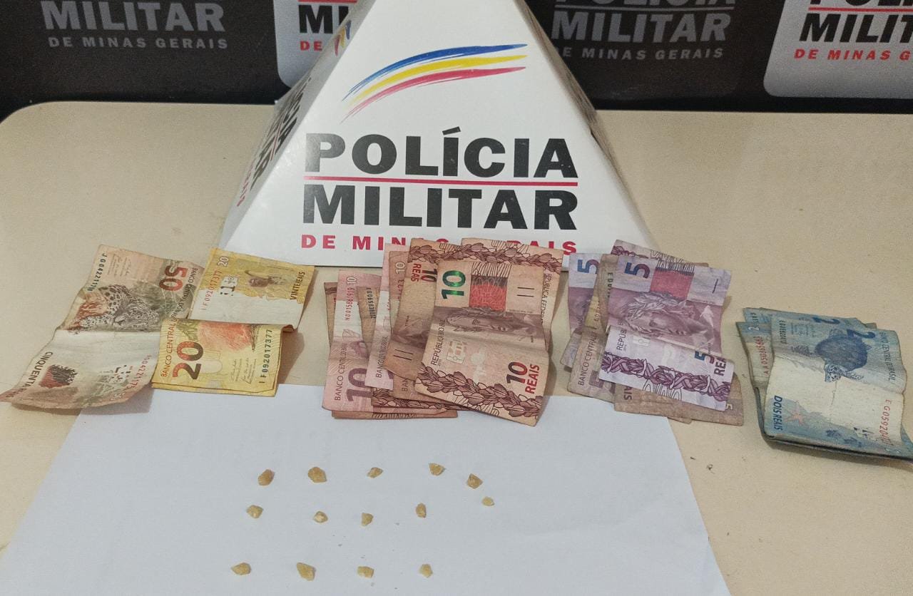 O menor infrator de 14 anos foi abordado e durante as buscas foi localizado um tubo plástico com 14 pedras de crack e a quantia de R$210,00 em dinheiro.