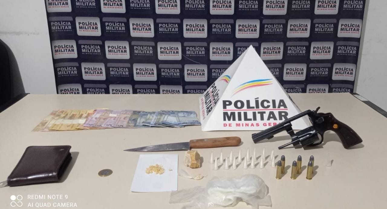 As equipes deslocaram até a residência do denunciado e, durante as buscas, foram encontrados um revólver com 06 munições, uma pedra maior de crack e 15 pinos de plástico com cocaína, além de R$232,00 em dinheiro.