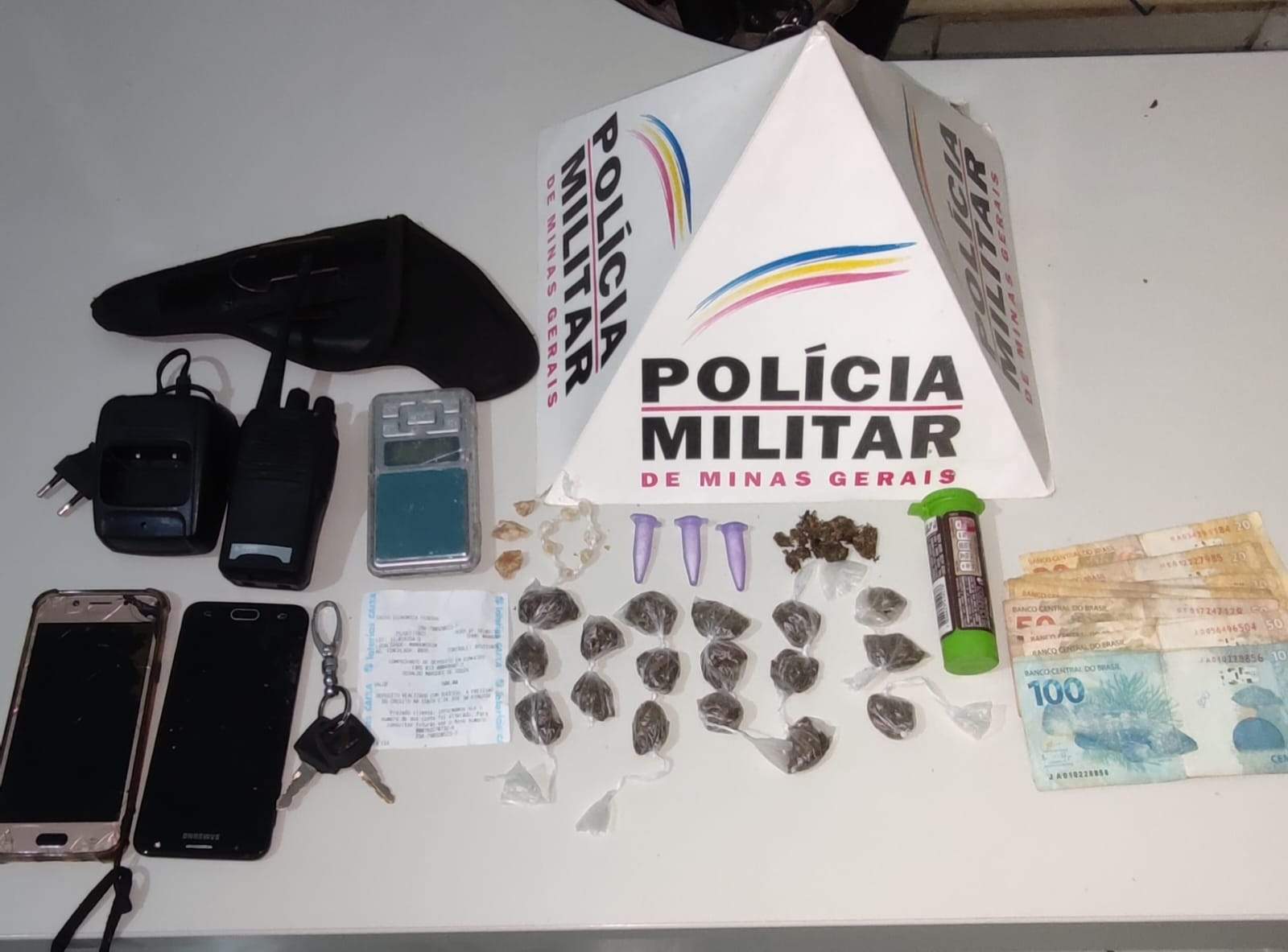 O abordado ainda tentou fugir entrando em sua residência onde foram apreendidos pela PM materiais relacionados ao tráfico de drogas, como: 17 buchas de maconha, 03 pinos de cocaína, 10 pedras de crack, 01 balança de precisão, 01 rádio comunicador e um coldre para arma de fogo, além de R$430,00 em dinheiro. A moto utilizada pelo autor de 18 anos também foi apreendida.