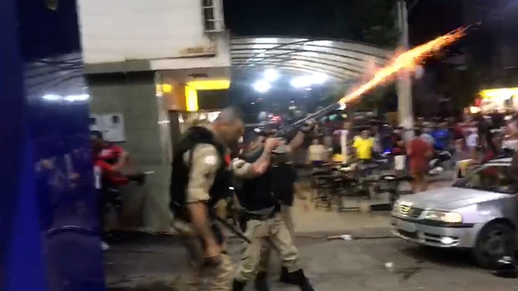 Posteriormente iniciou-se outra confusão onde alguns indivíduos que se encontravam em cima de um caminhão arremessaram blocos de concreto contra a equipe policial e gritavam com outros incitando a violência contra os militares, momento em que para repelir a injusta agressão foi realizado disparo de munição de elastômero e com uso de técnicas de dispersão e controle de distúrbios civis a equipe conseguiu retomar o controle da rua liberando o trânsito de veículos e dispersar a confusão.