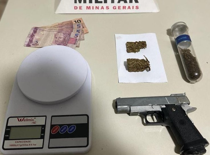 Equipe policial militar deslocou até o local, onde encontrou o denunciado de 26 anos e próximo dele uma porção de maconha. Em continuidade às diligências, na residência do denunciado, foram localizados ainda: 01 simulacro de arma de fogo; R$25,00 em dinheiro; outras porções de maconha prensada e 01 tubo de plástico contendo maconha esfarelada, além de 01 balança de precisão.