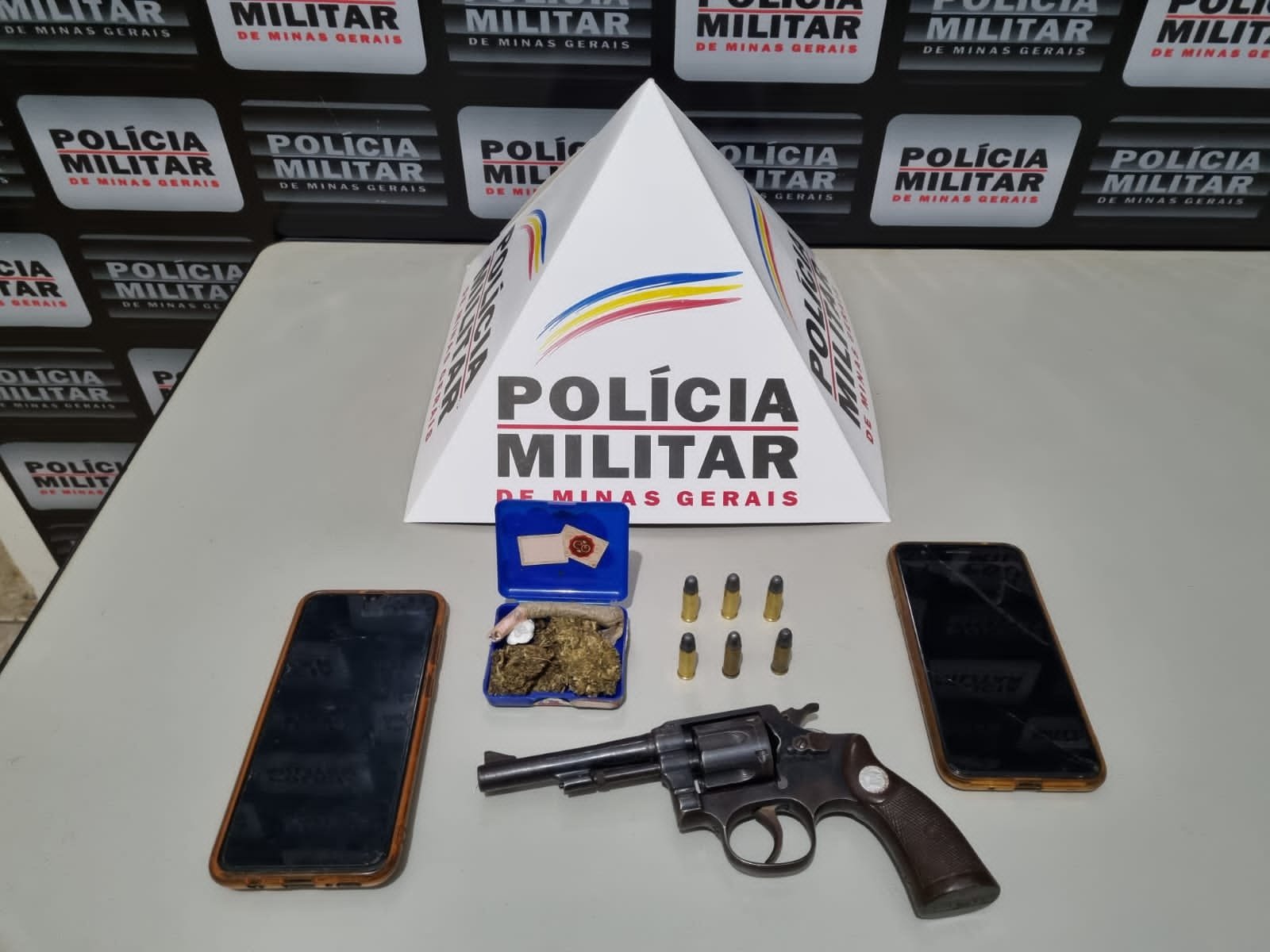 As equipes da PM realizaram buscas, conseguindo localizar um revólver calibre .32 com seis munições, um tablete de maconha e um papelote de cocaína.