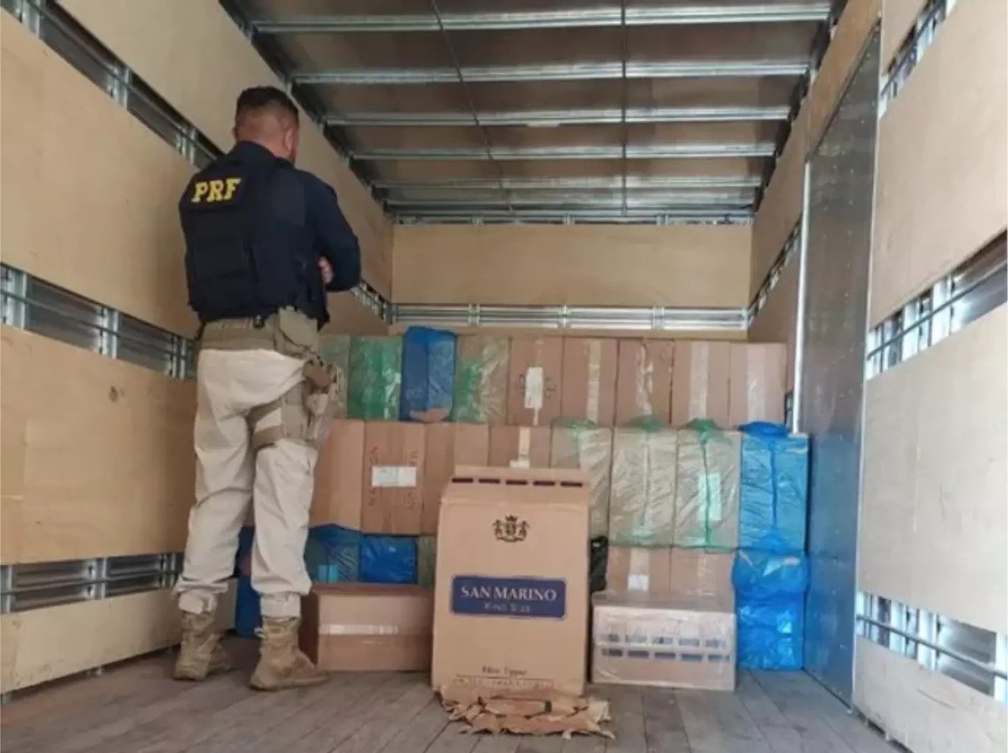 A apreensão ocorreu durante a abordagem de um caminhão baú, com placas de Garuva (SC), após os policiais localizarem mais de 100 caixas de cigarro contrabandeados, da marca Gift box e Madison, sem documentação fiscal.