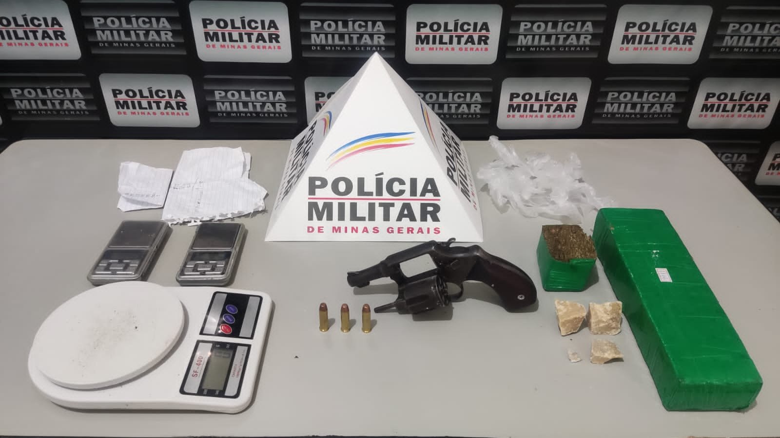 No local foi feito contato com o denunciado e durante as busca nas dependências da residência foram encontrados 02 tabletes de maconha, 03 pedras de crack, balanças de precisão e 01 revólver calibre 38 com três munições.
