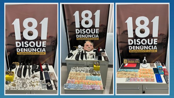 No local, a polícia encontrou joias, relógios, celulares, dinheiro, uma máscara imitando o rosto de um idoso, ácido para teste de ouro e dois simulacros de arma de fogo, do tipo pistola, além de outros objetos. O investigado foi preso em cumprimento de mandado de prisão. O outro homem foi liberado e o Conselho Tutelar foi acionado para tomar as medidas cabíveis em relação às crianças.