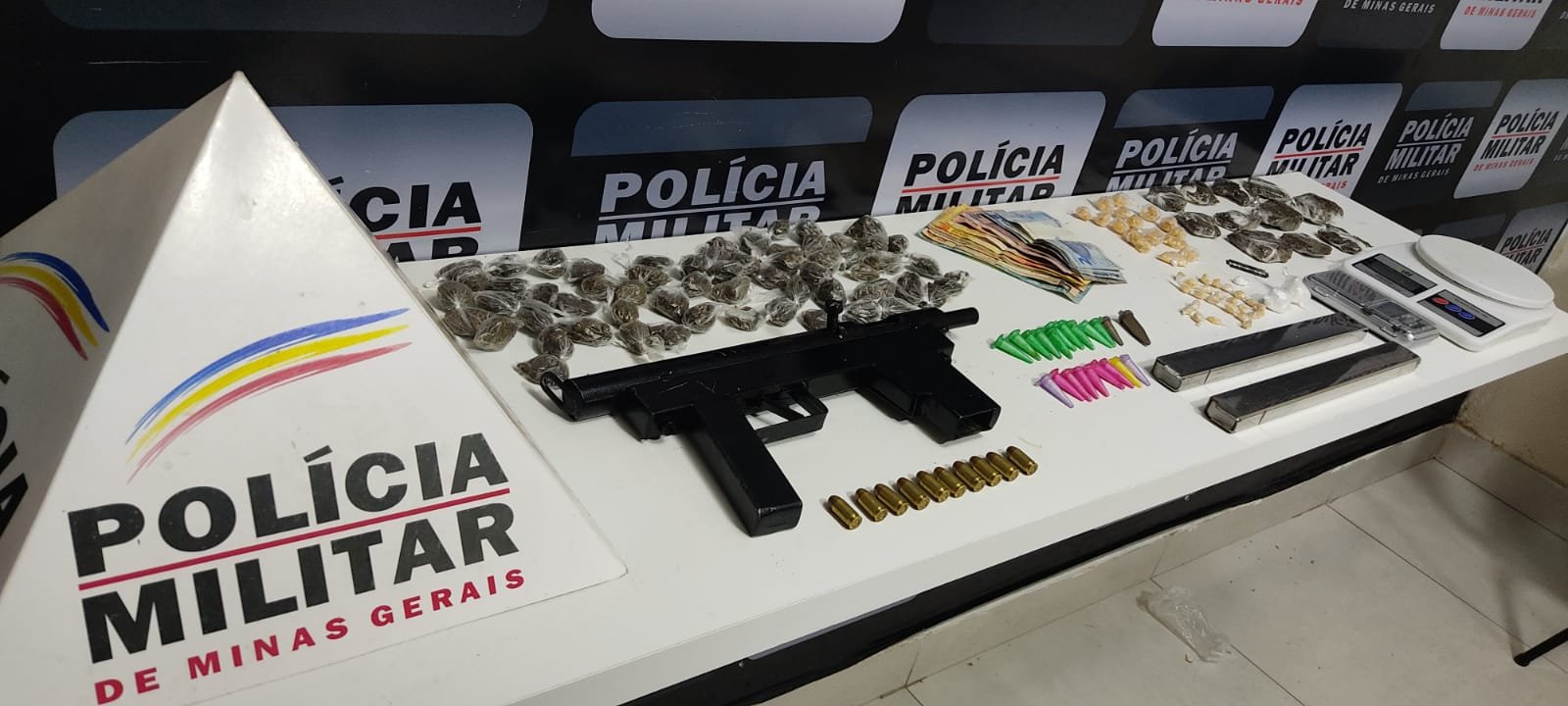 Policiais militares conseguiram apreender uma submetralhadora de fabricação caseira, 10 munições calibre 380, 02 carregadores, 21 ependorf's (pinos de plástico) e 03 buchas de cocaína, 61 buchas e 11 tabletes de maconha, 16 invólucros maiores de crack além de 23 pedras menores da mesma substância, 02 balanças de precisão, além de R$ 427,00 em dinheiro e diversos materiais para fracionar e embalar as drogas.