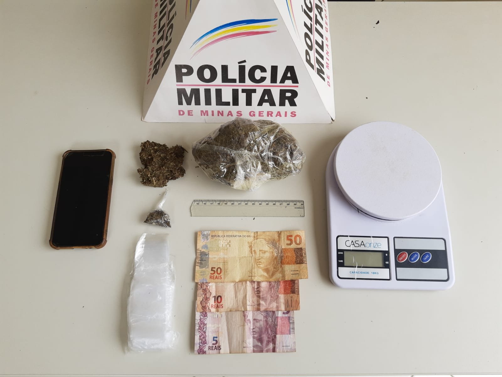 Na casa do jovem, foram encontrados um tablete e uma bucha de maconha, balança de previsão, sacolinhas para embalo da droga e certa quantia em dinheiro.