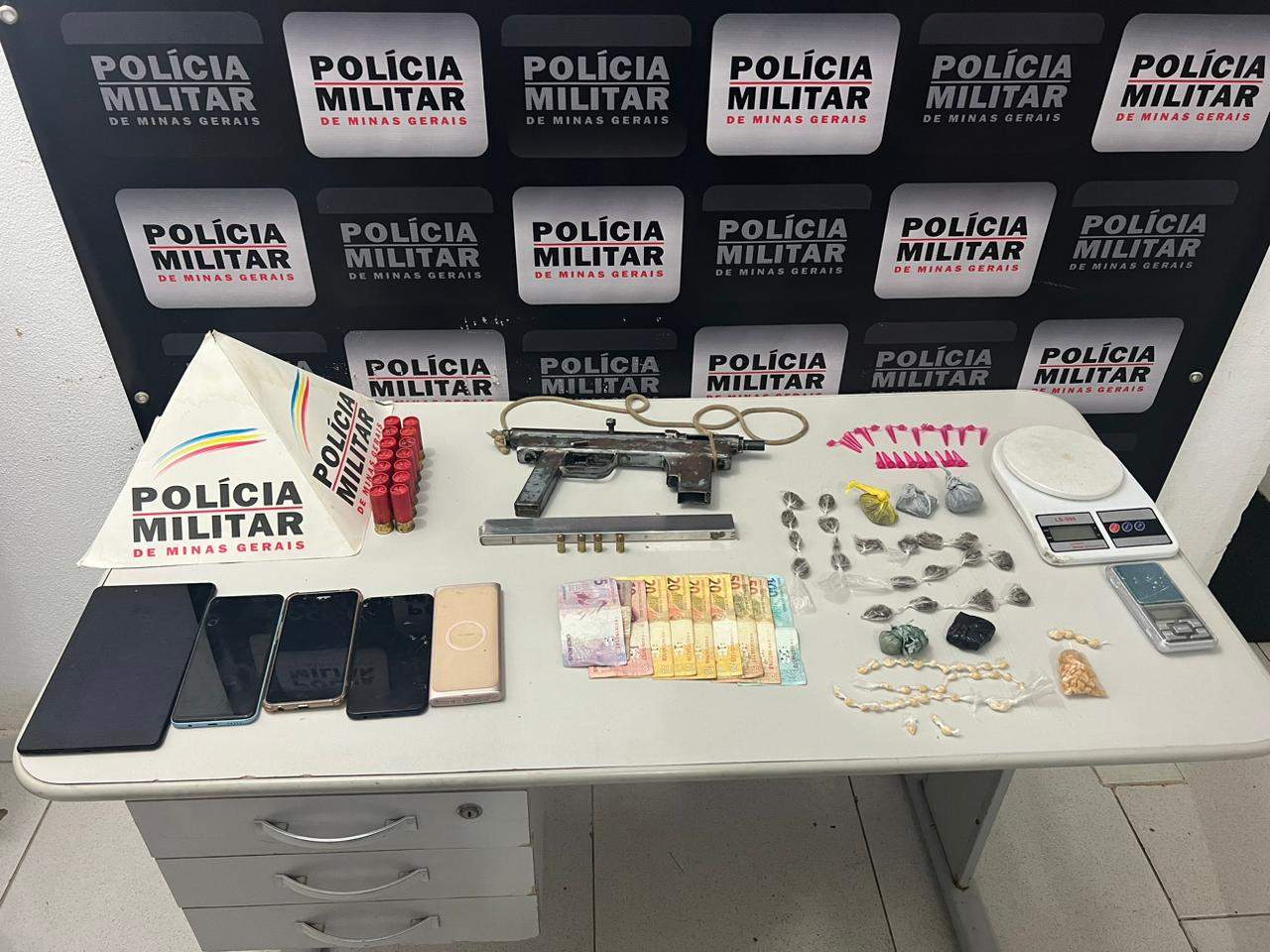 As equipes da PM visualizaram um indivíduo em atitude suspeita ao chegarem ao bairro. O rapaz entrou em um imóvel aparentemente abandonado. Ele foi encontrado e preso. Após buscas no local, foi apreendida uma submetralhadora calibre 380 de fabricação artesanal, contendo um carregador com 04 munições intactas de mesmo calibre; 14 munições calibre 12 intactas; 25 porções de maconha; 39 pedras de crack menores; 02 invólucros maiores contendo diversas pedras de crack fracionadas; 09 microtubos contendo cocaína; 02 balanças de precisão e outros materiais relacionados ao tráfico de drogas.