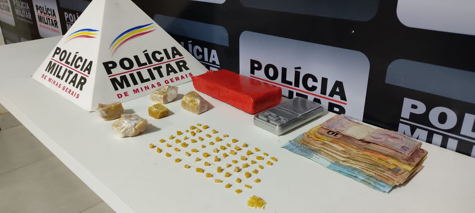 Durante as buscas no local e na residência do menor abordado foram localizadas 01 barra de maconha, 70 pedras e uma porção de crack, balança de precisão e R$1.195,00.