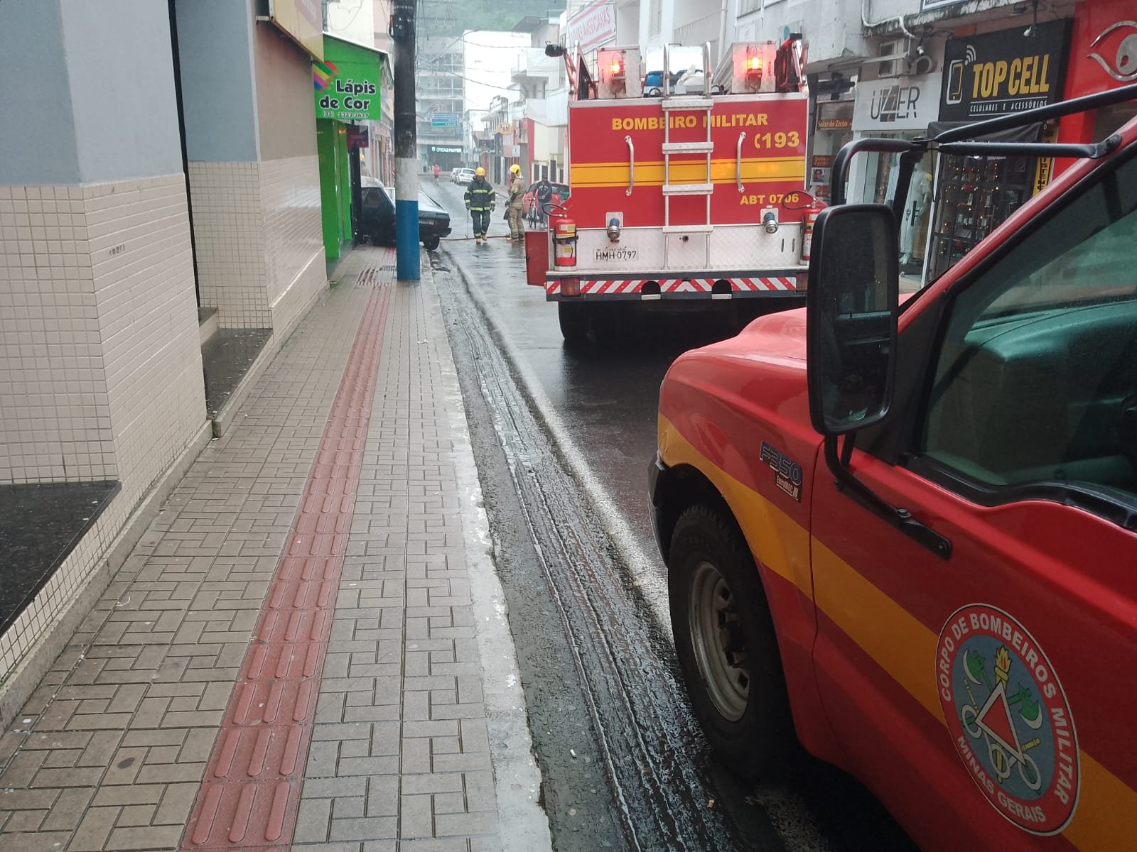 Quando as equipes dos Bombeiros chegaram, o carro estava em chamas na calçada, próximo a uma loja, com risco de propagação. Em poucos minutos, conseguiram debelar as chamas e evitar que atingisse os imóveis. Somente a parte próxima ao motor que foi atingida.