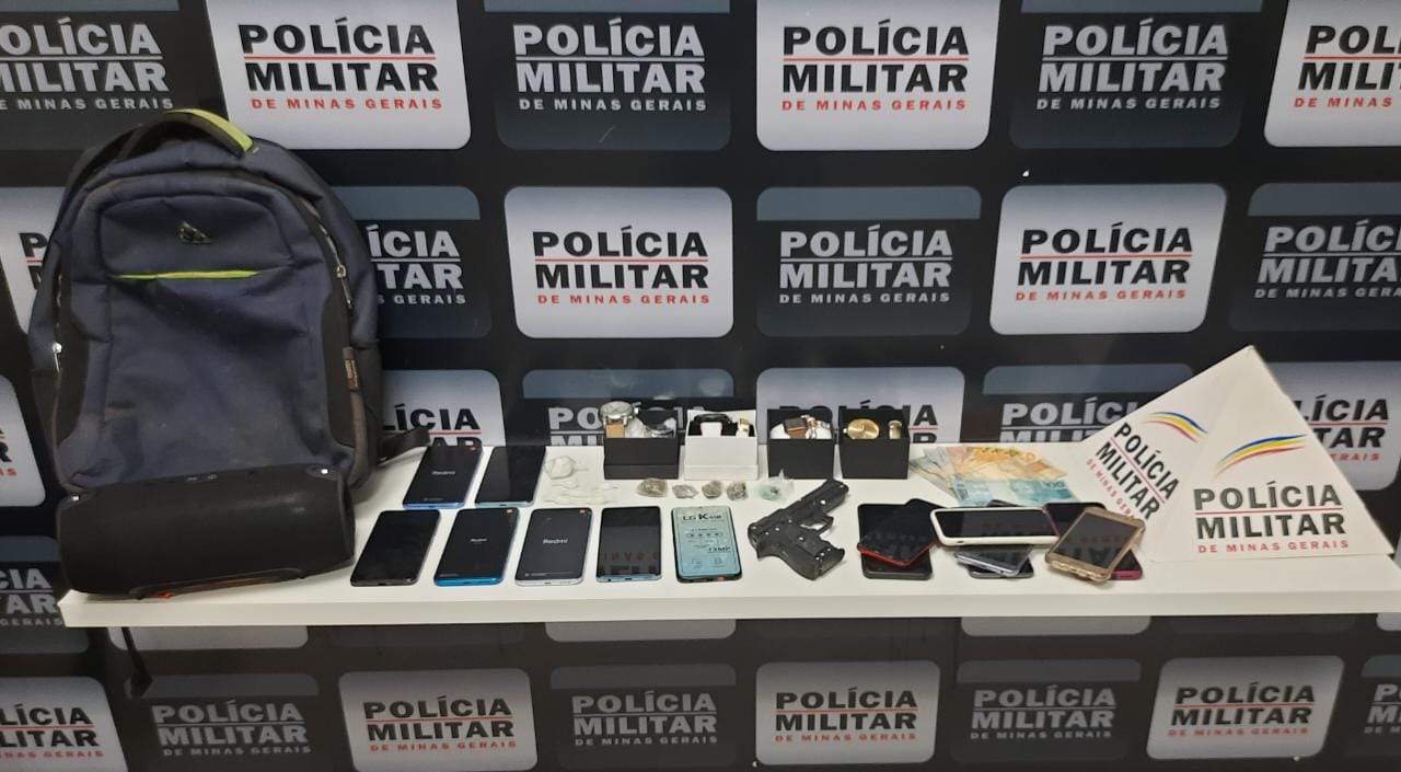 Foram localizados e recuperados sete celulares, sete relógios, 01 caixa de som e R$ 272,00 em dinheiro. Ainda foram apreendidas 05 buchas de maconha e 06 buchas de cocaína.
