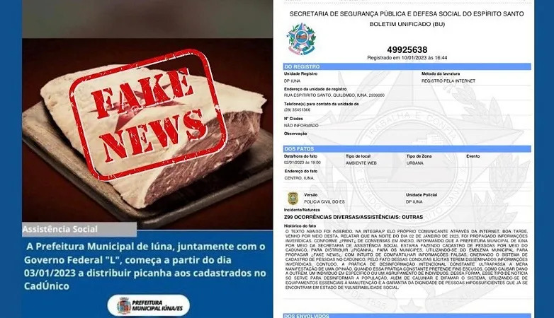 IÚNA (ES) - O que para uns pode parecer uma brincadeira, mas na verdade é a propagação de uma notícia falsa, virou caso de polícia em Iúna. A Secretaria Municipal de Assistência Social registrou um Boletim de Ocorrência (BO) para denunciar uma fake news que envolvia o nome da Secretaria e utilizava o brasão oficial do município, para espalhar uma distribuição de picanha para pessoas inscritas no CadÚnico.