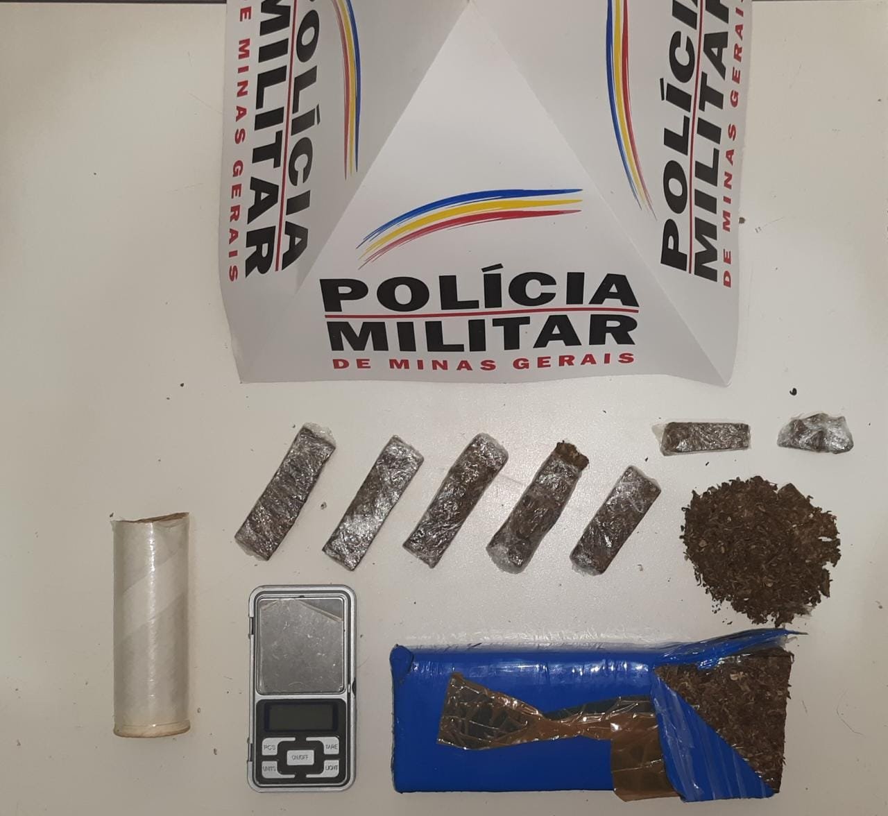 Após receber denúncias via 190, as equipes da PM realizaram diligências para verificação das informações, e após buscas na residência denunciada, os militares conseguiram localizar 01 barra, 07 tabletes e 01 bucha de maconha, além de materiais para embalar os entorpecentes.