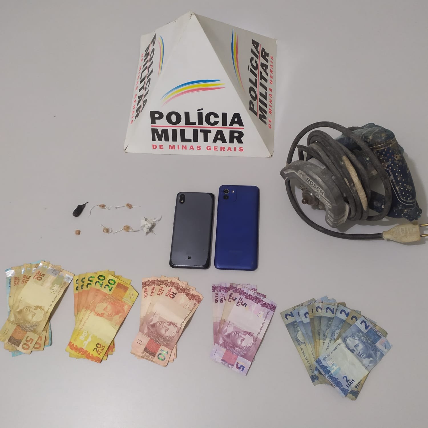 No local foi feito contato com o casal denunciado e durante as buscas foram encontradas 05 pedras de crack, 01 bucha de maconha, R$446,00, aparelhos celulares e uma makita, a qual eles não souberam indicar procedência.