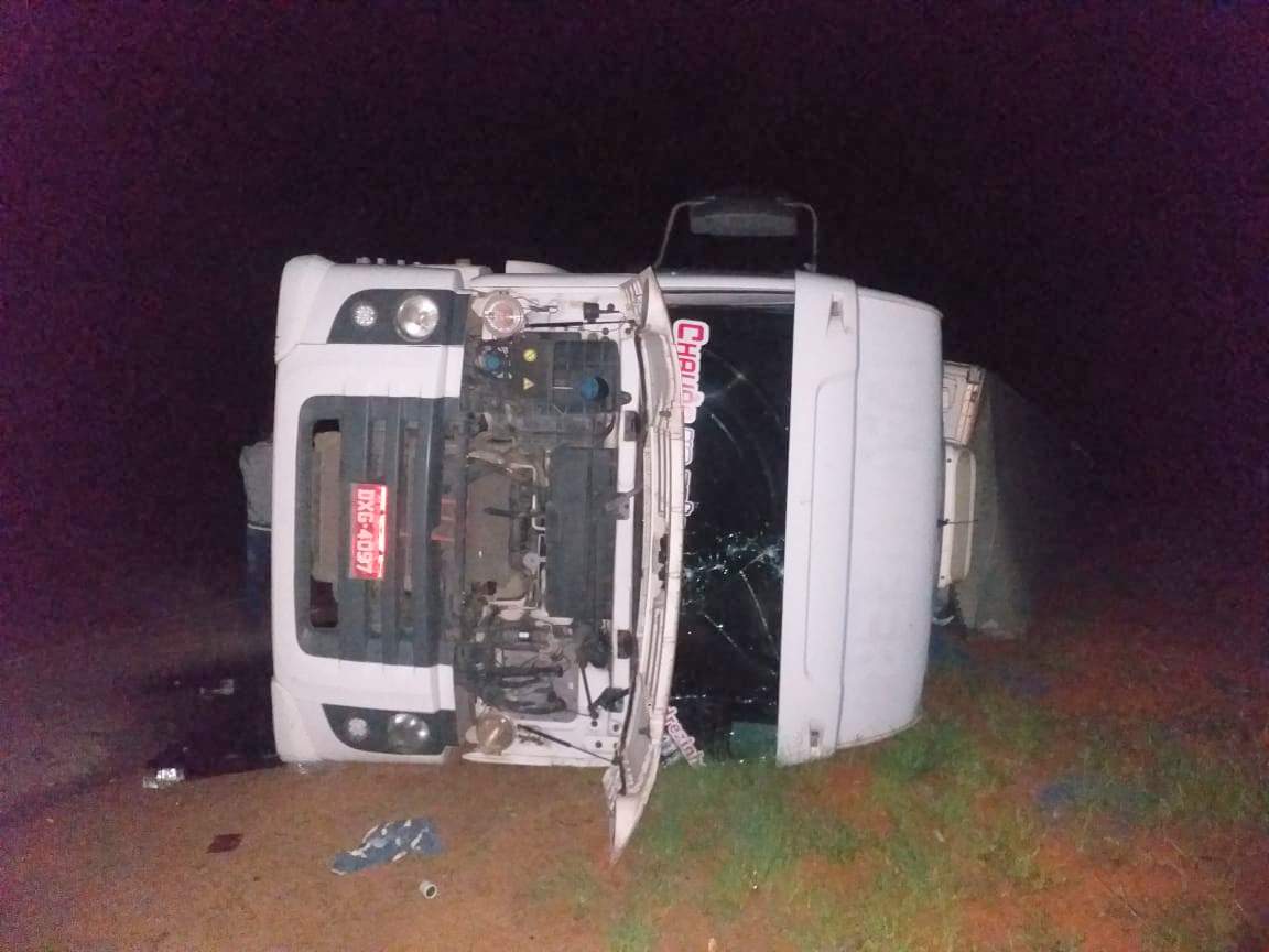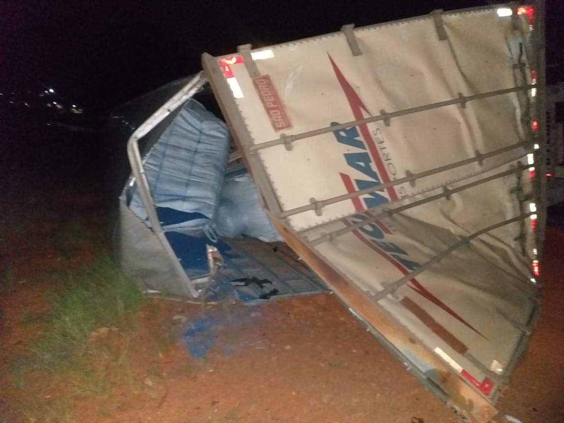 Uma carreta bau carregada, tombou numa curva. Motorista sofreu ferimentos leves e foi socorrido ao Pronto Atendimento do HCL pelo Corpo de Bombeiros.