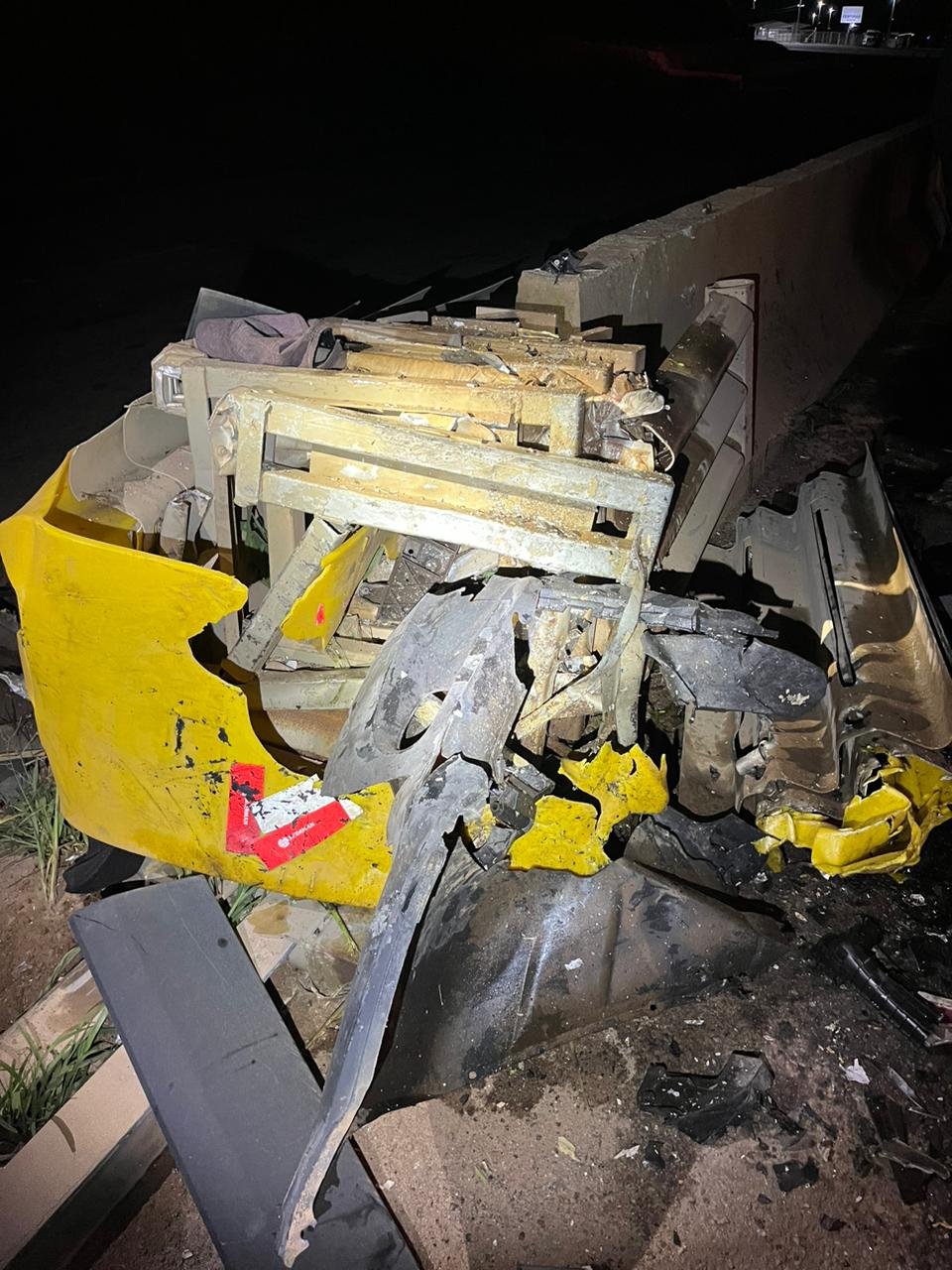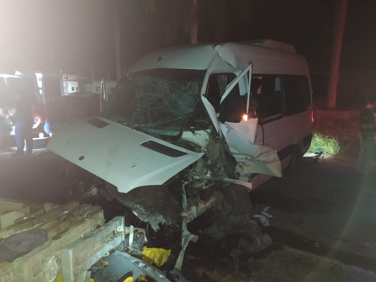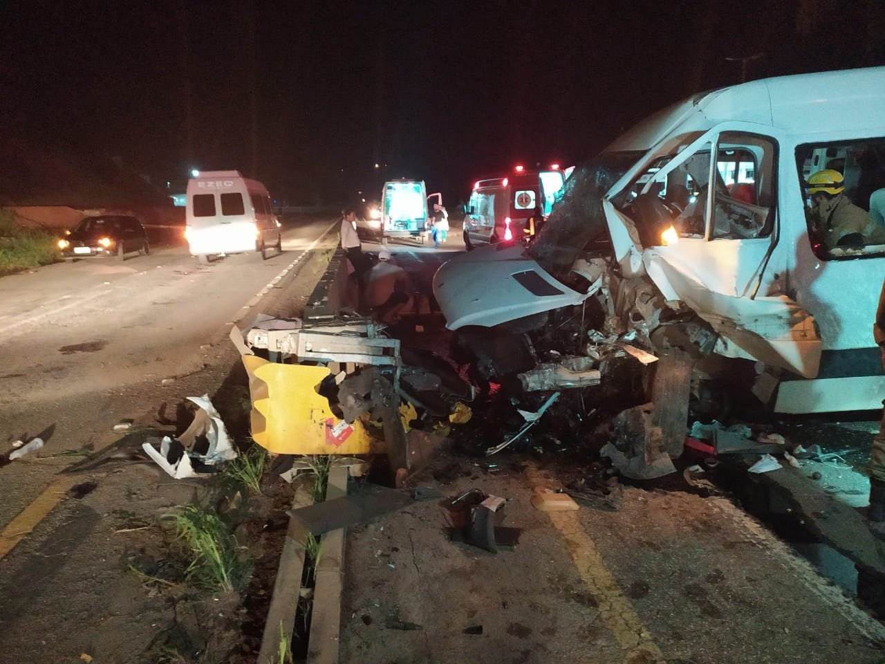 O acidente foi por volta de 23 horas. Uma van (modelo Sprinter) bateu na divisa de concreto central da pista da BR-262, no km 13, em frente à Fertipar, em Martins Soares.