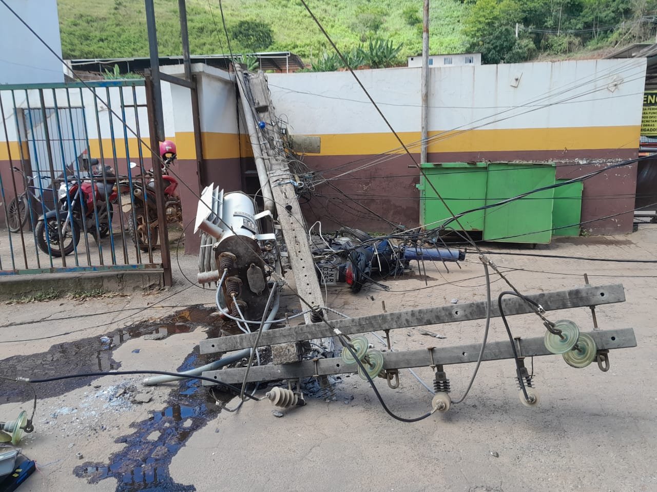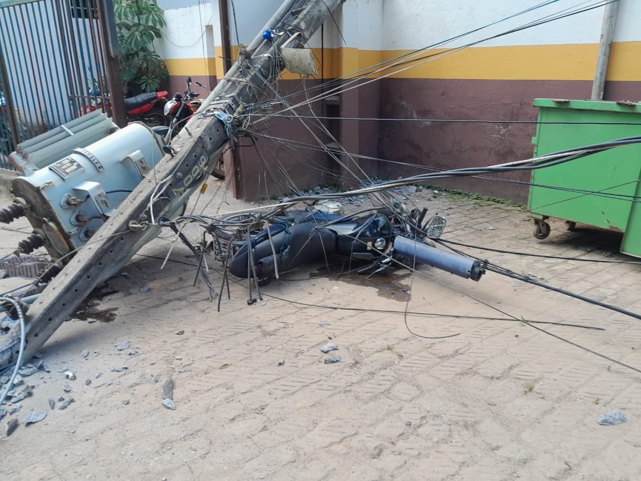 Um dos postes, com transformador, quebrou e caiu em cima de uma motocicleta, que está vazando combustível. O condutor da moto não foi atingido.
