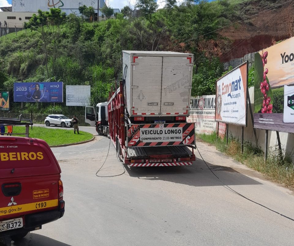MANHUAÇU (MG) - Uma carreta “cegonheira” passou na rua em frente a Secretaria de Obras da Prefeitura de Manhuaçu e derrubou postes e arrebentou fios de energia elétrica, por volta de 9h30 da manhã desta quarta-feira, 01/02.