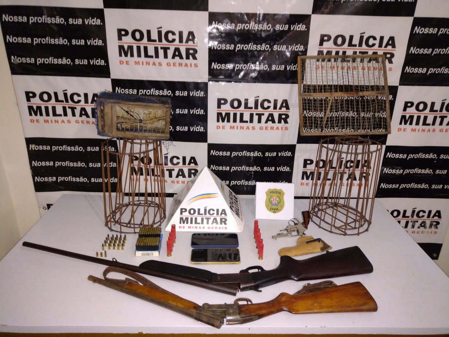 No Córrego Boa Sorte, os militares fizeram contato com o autor, de 29 anos e durante as buscas na residência foram localizadas 01 espingarda e 01 revólver calibre 22, 123 munições do mesmo calibre, além de 02 animais da fauna silvestre e alçapões.