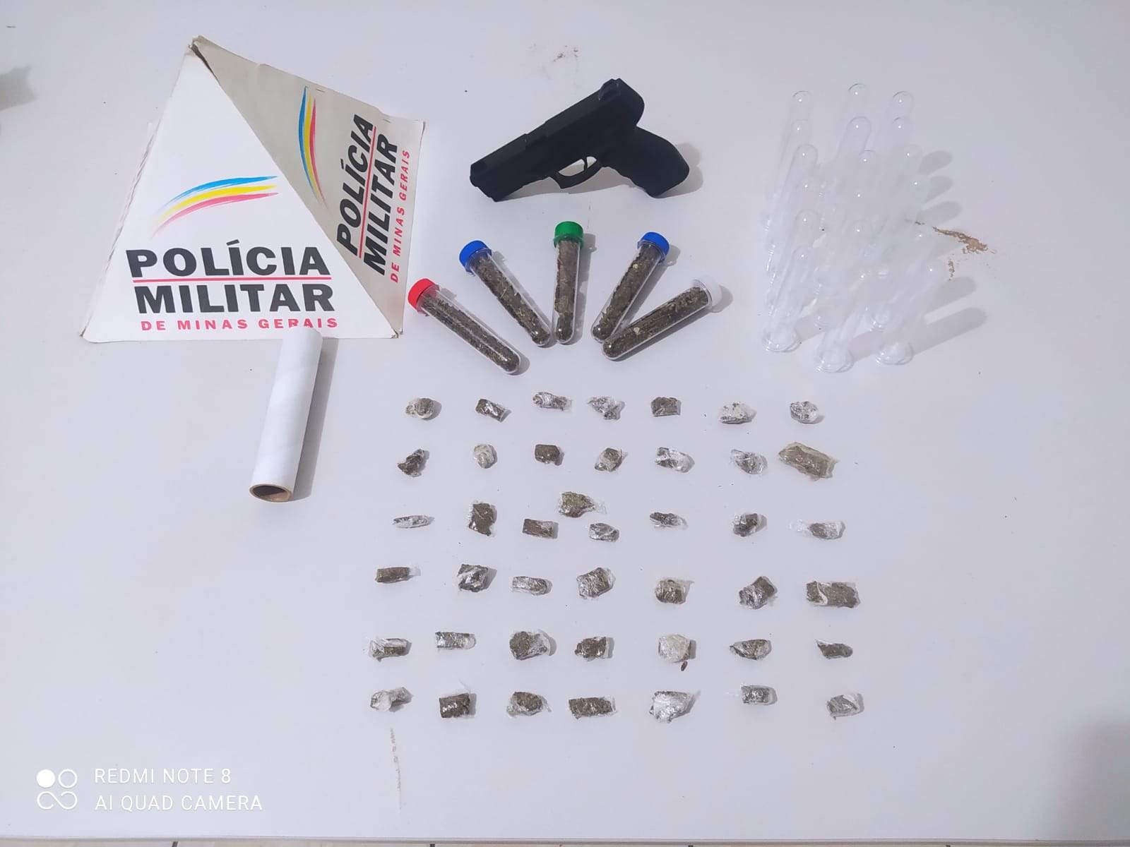 A Polícia Militar conseguiu identificar o autor. Na casa dele, foi apreendida uma réplica de arma de fogo, 43 tabletes de maconha e 5 tubos contendo maconha, além de 18 tubos vazios.