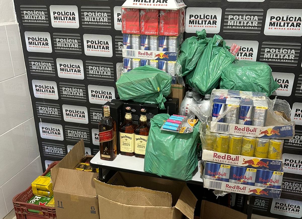 Os policiais militares recuperaram 71 latas de cerveja Heineken, 173 latas energético Red Bull, 06 garrafas energético Red Hot, 32 garrafas de whisky, mil isqueiros, 751 maços de cigarro e o equipamento de gravação das câmeras.