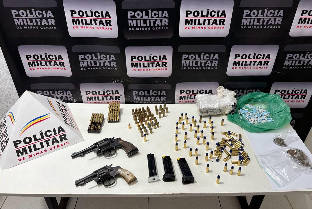 Durante as buscas foram encontradas algumas sacolas contendo 02 armas de fogo, sendo 01 revólver calibre 32, 01 revólver calibre 38, além de 14 munições calibre 22, 14 munições calibre 32, 25 munições calibre 380, 24 munições calibre 9mm, 20 munições calibre 45, 81 munições calibre 38, 01 porção de cocaína, 263 comprimidos de ecstasy, 02 porções de maconha e 03 carregadores de pistola.