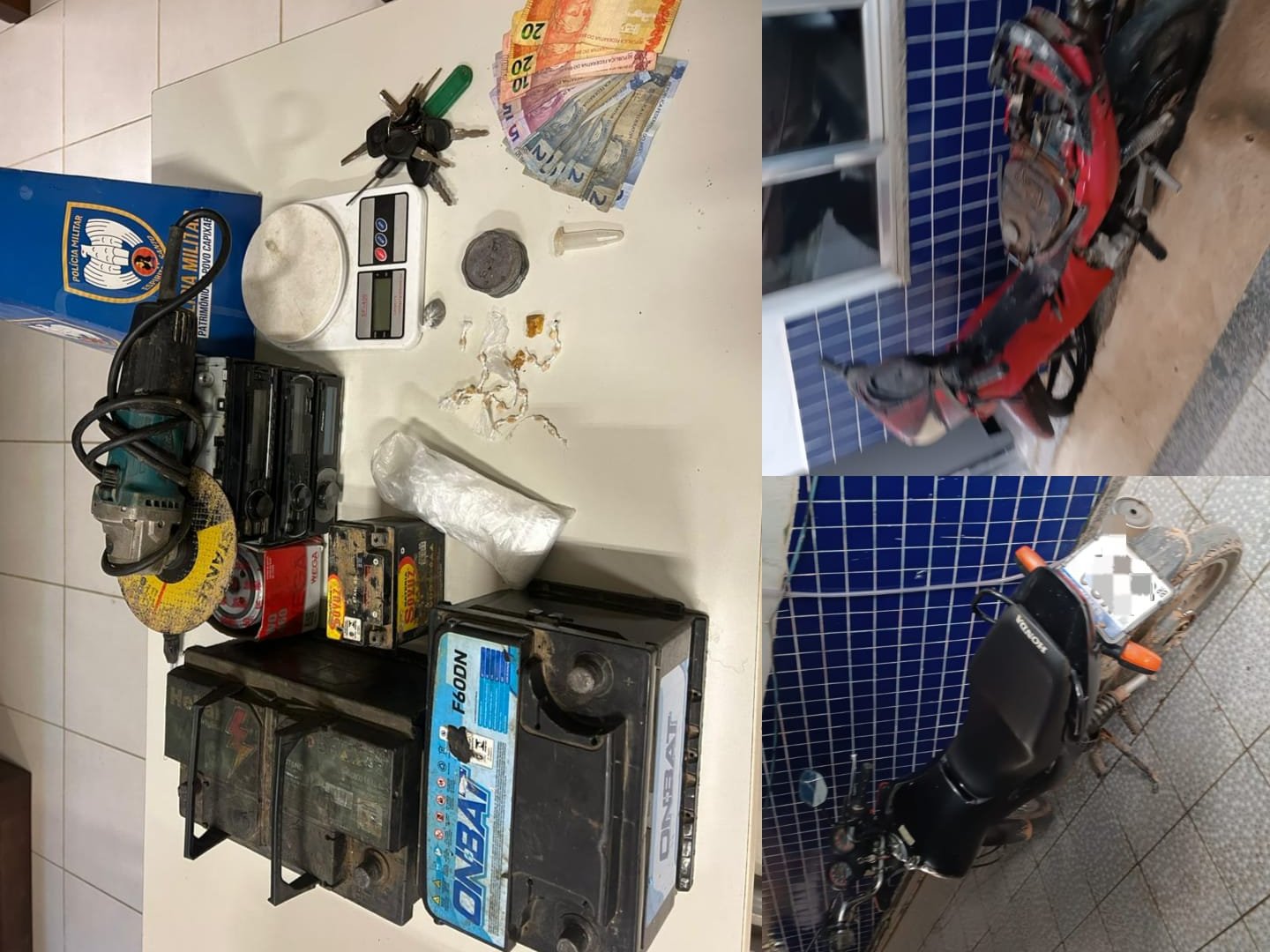Entre os produtos recuperados e apreendidos estão uma moto com restrição de furto/roubo, uma Shineray com sinais de adulteração, pedaços e pedras de crack, uma bucha de maconha, uma balança de precisão, material para embalagem de drogas, dinheiro em espécie, três aparelhos de som automotivo, uma cadeirinha de bebê, duas baterias de automóvel, um aspirador de pó, uma esmerilhadeira e uma bateria de moto.