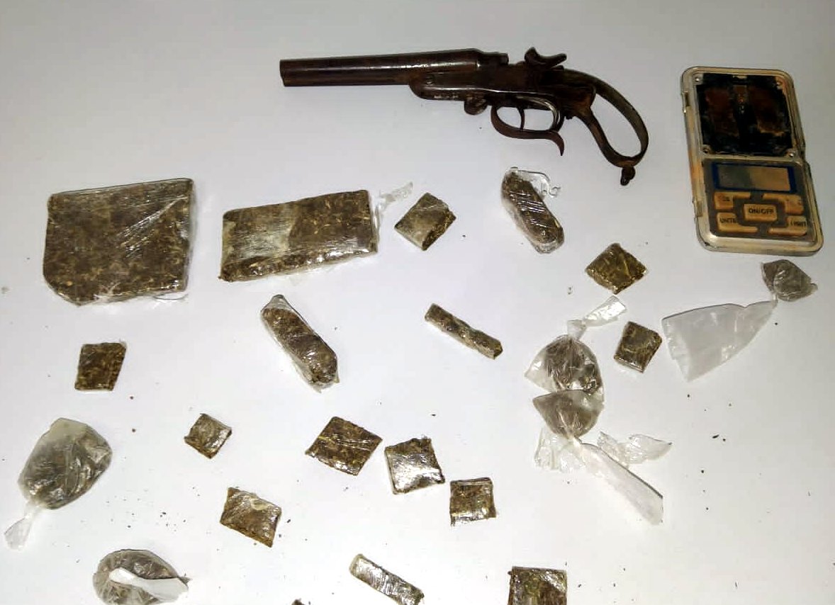 Já no segundo endereço no ainda centro da cidade foram apreendidos 19 tabletes e 05 buchas de maconha, 01 balança de precisão, 04 cartuchos de espingarda de caça, 01 garrucha calibre 22, com 01 munição do mesmo calibre, 01 munição calibre 32 e 01 calibre 38. No local foi preso um autor, de 41 anos.