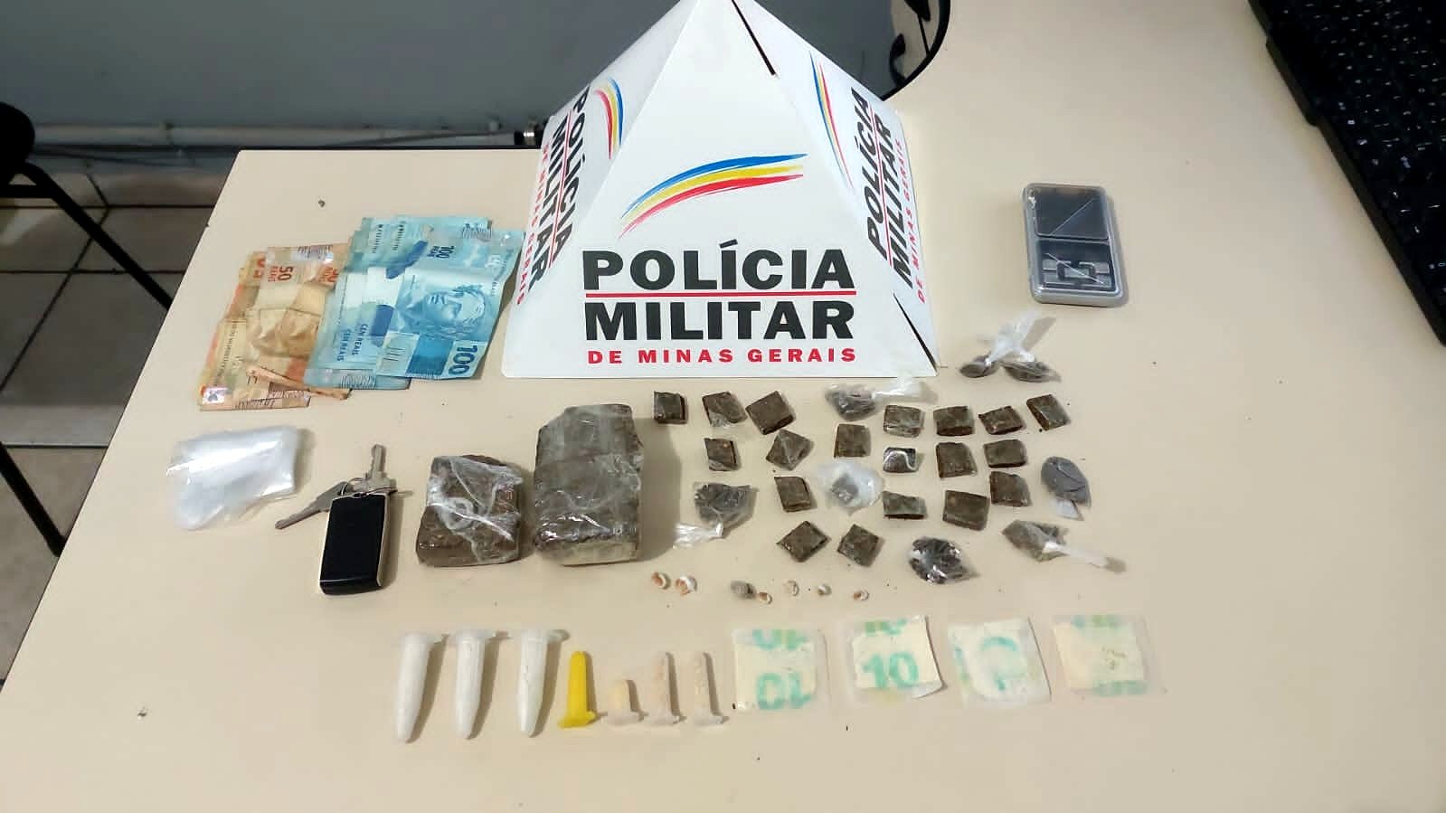 No terceiro local, Rua Carangola, foi preso um indivíduo, de 38 anos, sendo localizados durante as buscas 04 telefones celulares, 02 balanças de precisão, 11 porções de cocaína, 02 barras, 09 buchas e 20 tabletes de maconha, além de 05 pedras de crack.
