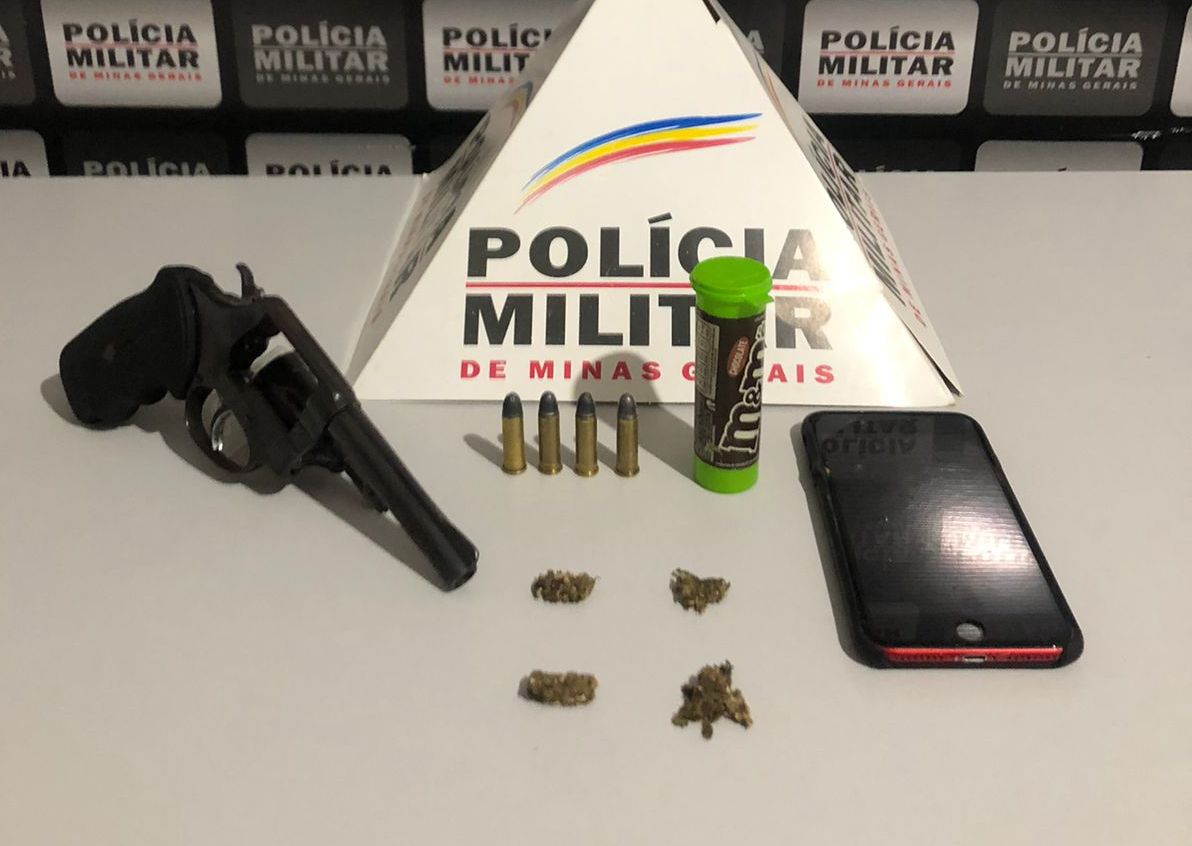 Após a prisão, a equipe policial realizou uma varredura no local e encontrou um revólver calibre .38, marca Rossi, com numeração suprimida, quatro cartuchos intactos, um aparelho celular e um pequeno pote contendo quatro porções de maconha.
