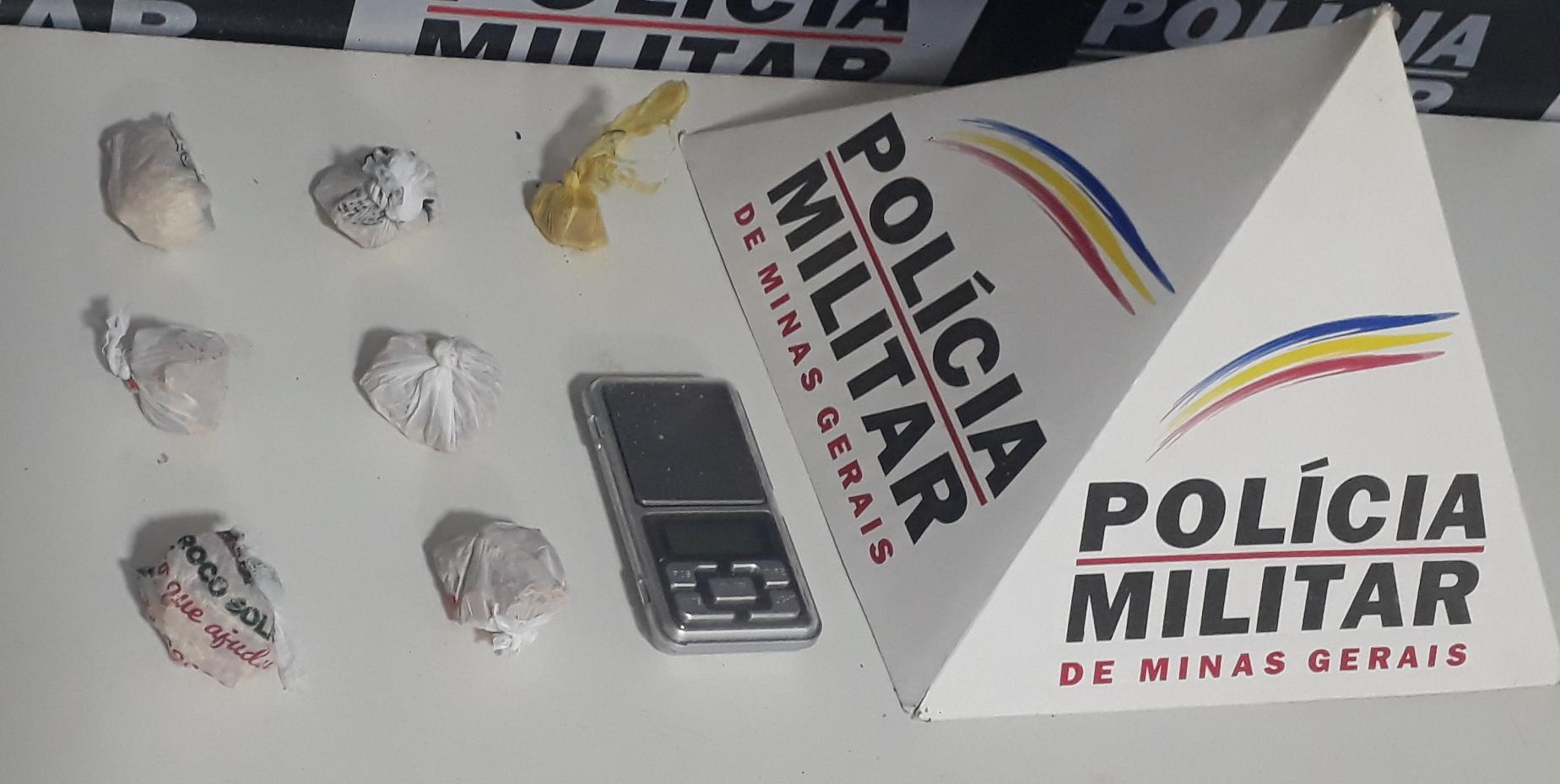 Na Rua Augusto Satlher foi feita aplicação do cão de faro Aquiles, sendo localizada uma sacola escondida em um hidrômetro com 07 pedras de crack e 01 balança de precisão.