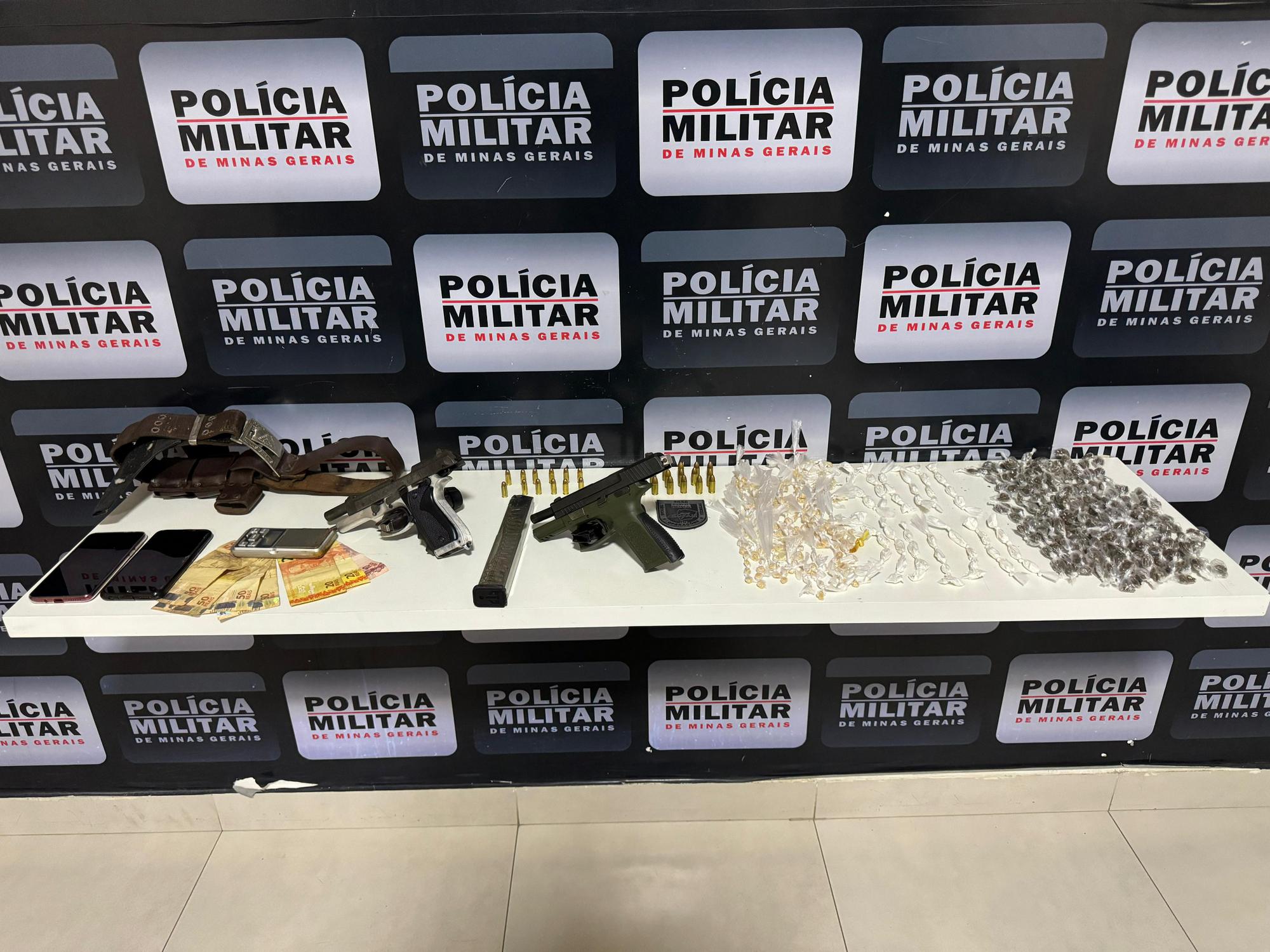 Com os suspeitos a Polícia Militar localizou duas pistolas 9mm, sendo uma delas com seletor de rajada, munições, drogas e dinheiro.