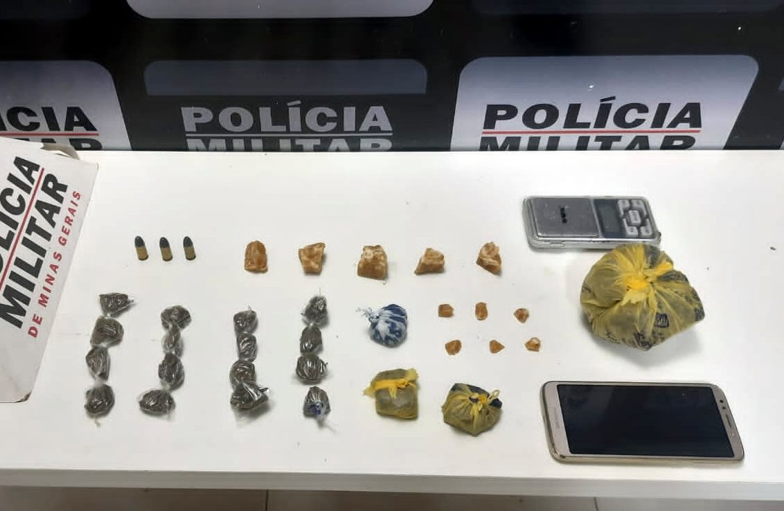 No local foi localizado o denunciado e durante as buscas em sua residência foram encontradas 19 buchas de maconha, 11 pedras de crack, 01 balança de precisão, 03 munições 9 mm e R$100,00.