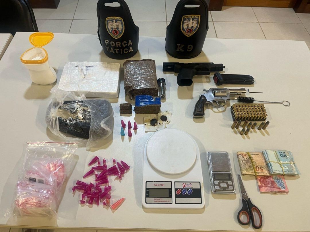 Foram apreendidos um revólver, uma pistola 9mm, munições, 1,765 kg de cocaína, 575 gramas de maconha, duas buchas de haxixe, 4.710 reais em dinheiro, além de 2.000 guaranis (dinheiro paraguaio) e 20 pesos argentinos, além de tesoura, material para embalo e balança de precisão para drogas.
